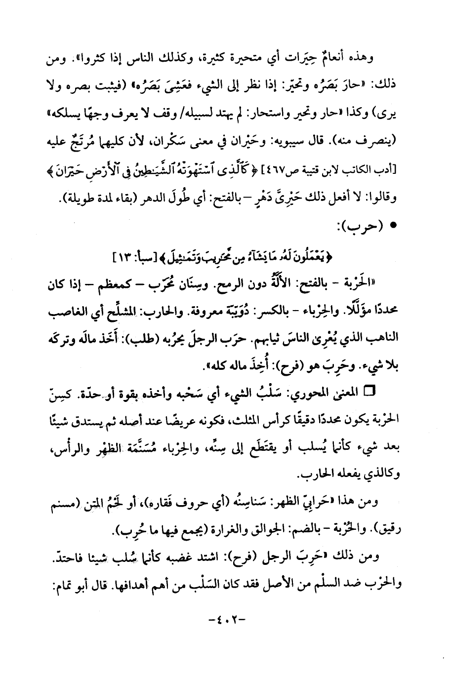 "الحَربة -بالفتح: الآَلَّةُ دون الرمح. وسِنَان مُحرب -كمعظم- إذا كان محددًا مؤَلَّلًا. والحِرْباء -بالكسر: دُوَيبة معروفة. والحارب: المشلِّح أي الغاصب الناهب الذي يُعْرِى الناسَ ثيابهم. حرَب الرجلَ يحرُبه (طلب): أخَذ مالَه وتركه بلا شيء. وحَرِبَ هو (فرح): أُخِذَ ماله كله ".