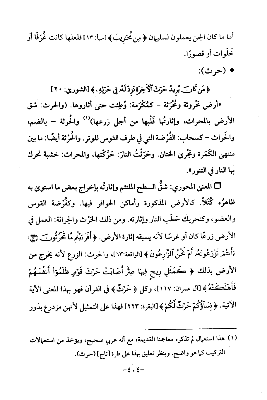 Qشقُّ السطح الملتئم وإثارتُه بإخراج بعض ما استوي به ظاهرُه كُتَلًا. كالأرض المذكورة وأماكن الحوافر فيها. وكفُرضة القوس والعضو، وكتحريك حَطَب النار وإثارته. ومن ذلك الحَرْث والحِراثة: العمل في الأرض زرعًا كان أو غرسًا لأنه يسبقه إثارة الأرض. {أَفَرَأَيْتُمْ مَا تَحْرُثُونَ (63) أَأَنْتُمْ تَزْرَعُونَهُ أَمْ نَحْنُ الزَّارِعُونَ} [الواقعة: 63، 64]، والحرث: الزرع لأنه يخرج من الأرض بذلك {كَمَثَلِ رِيحٍ فِيهَا صِرٌّ أَصَابَتْ حَرْثَ قَوْمٍ ظَلَمُوا أَنْفُسَهُمْ فَأَهْلَكَتْهُ} [آل عمران: 117]، وكل {حَرْثَ} في القرآن فهو بهذا المعنى الآية الآتية. {نِسَاؤُكُمْ حَرْثٌ لَكُمْ} [البقرة: 223] فهذا على التمثيل لأنهن مزدرع بذور