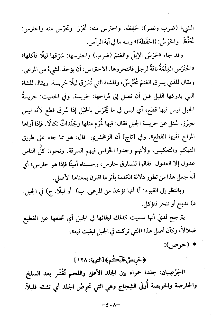 وقد جاء "حَرَسَ الإبلَ والغنمَ (ضرب) واحترسها: سَرَقها ليلًا فأكلها ""احترس الغِلمَةُ ناقة لرجل فانتحروها. الاحتراس: أن يؤخذ الشيءُ من المرعى. ويقال للذي يسرق الغنمَ مُحْتَرِسٌ، وللشاة التي تُنرَق ليلًا حَرِيسة. ويقال للشاة التي يدركها الليل قبل أن تصل إلى مُراحها: حَريسة. وفي الحديث: حريسةُ الجبل ليس فيها قطع، أي ليس في ما يُحرَس بالجبَل إذا سُرق قطع لأنه ليس بحِرز. سُئل عن حريسة الجبل فقال: فيها غُرْم مثلها وجَلَدات نكالًا. فإذا آواها المراح ففيها القطع ". وفي [تاج] أن الزمخشري قال: هو مما جاء على طريق التهكم والتعكيس، ولأنهم وجدوا الحُراس فيهم السرقة. ونحوه: كلُّ الناس عدول إلا العدول. فقالوا للسارق حارس، وحسبناه أمينًا فإذا هو حارس "أي أنه جعل هذا من تطور دلالة الكلمة بأثر ما اقترن بمعناها الأصلي.