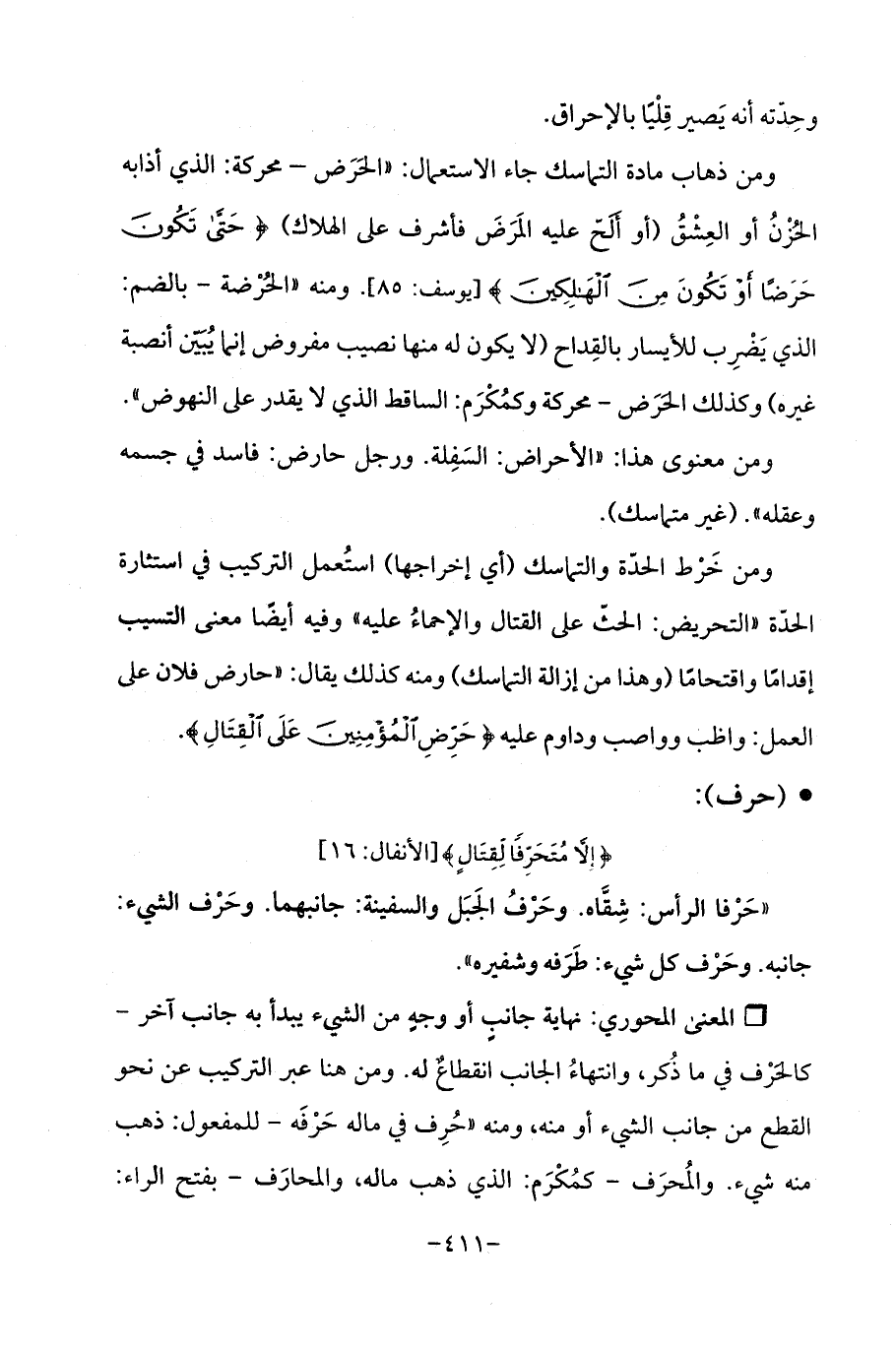 ومن معنوى هذا: "الأحراض: السَفِلة. ورجل حارض: فاسد في جسمه وعقله ". (غير متماسك).