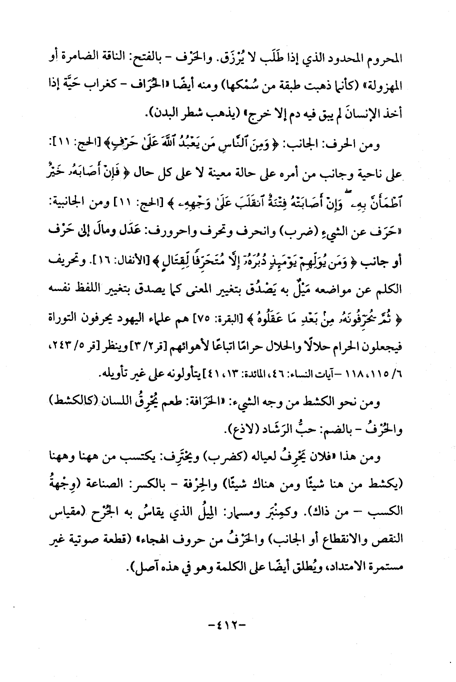 ومن الحرف: الجانب: {وَمِنَ النَّاسِ مَنْ يَعْبُدُ اللَّهَ عَلَى حَرْفٍ} [الحج: 11]: على ناحية وجانب من أمره على حالة معينة لا على كل حال {فَإِنْ أَصَابَهُ خَيْرٌ اطْمَأَنَّ بِهِ وَإِنْ أَصَابَتْهُ فِتْنَةٌ انْقَلَبَ عَلَى وَجْهِهِ} [الحج: 11] ومن الجانبية: "حَرَف عن الشيءِ (ضرب) وانحرف وتحرف واحرورف: عَدَل ومالَ إلى حَرْف أو جانب {وَمَنْ يُوَلِّهِمْ يَوْمَئِذٍ دُبُرَهُ إِلَّا مُتَحَرِّفًا لِقِتَالٍ} [الأنفال: 16]. وتحريف الكلم عن مواضعه مَيلٌ به يَصدُق بتغيير المعنى كما يصدق بتغيير اللفظ نفسه {ثُمَّ يُحَرِّفُونَهُ مِنْ بَعْدِ مَا عَقَلُوهُ} [البقرة: 75] هم علماء اليهود يحرفون التوراة فيجعلون الحرام حلالًا والحلال حرامًا اتباعًا لأهوائهم [قر 2/ 3] وينظر [قر 5/ 243، 6/ 115، 118 - آيات النساء: 46، المائدة: 13، 41] يتأولونه على غير تأويله.