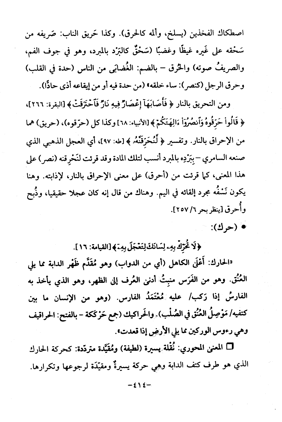 ومن التحريق بالنار {فَأَصَابَهَا إِعْصَارٌ فِيهِ نَارٌ فَاحْتَرَقَتْ} [البقرة: 266]، {قَالُوا حَرِّقُوهُ وَانْصُرُوا آلِهَتَكُمْ} [الأنبياء: 68] وكذا كل (حرّقوه)، (حريق) هما من الإحراق بالنار. وتفسير {لَنُحَرِّقَنَّهُ} [طه: 97]، أي العجل الذهبي الذي صنعه السامري -بِبَرْدِه بالمبرد أنسب لتلك المادة وقد قرئت لنَخرِقنه (نصر) على هذا المعنى، كما قرئت من (أحرق) على معنى الإحراق بالنار، لإذابته. وهنا يكون نَسْفُه مجرد إلقائه في اليم. وهناك من قال إنه كان عجلا حقيقيا، وذُبح وأحرق [ينظر بحر 6/ 257].