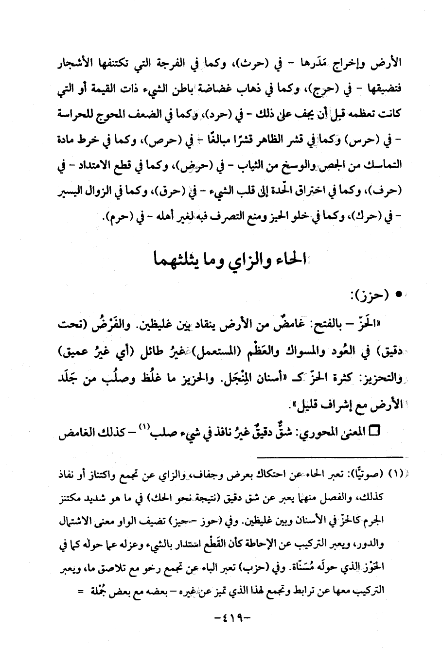 (¬1) (صوتيًا): تعبر الحاء عن احتكاك بعرض وجفاف، والزاي عن تجمع واكتناز أو نفاذ كذلك، والفصل منهما يعبر عن شق دقيق (نتيجة فحو الحك) في ما هو شديد مكتنز الجرم كالحزّ في الأسنان وبين غليظين. وفي (حوز - حيز) تضيف الواو معنى الاشتمال والدور، ويعبر التركيب عن الإحاطة كأن القَطع استدار بالشيء. وعزله عما حوله كما في الحوز الذي حولَه مُسَناة. وفي (حزب) تعبر الباء عن تجمع رخو مع تلاصق ما، ويعبر التركيب معها عن ترابط وتجمع لهذا الذي تميز عن غيره -بعضه مع بعضه جُملة=