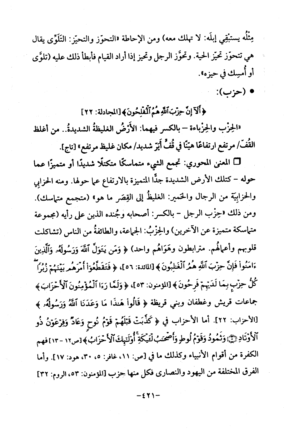 Qتجمع الشيء متماسكًا متكتلًا شديدًا أو مميزًا عما حوله -كتلك الأرض الشديدة جدًّا المتميزة بالارتفاع عما حولها. ومنه الحزابِي والحزابِية من الرجال والحمير: الغليظُ إلى القِصر ما هو " (متجمع متماسك). ومن ذلك "حِزب الرجل -بالكسر: أصحابه وجُنده الذين على رأيه (مجموعة متماسكة متميزة عن الآخرين) والحِزْبُ: الجماعة، والطائفةُ من الناس (تشاكلت قلوبهم وأعمالُهم. مترابطون وهَوَاهُم واحد) {وَمَنْ يَتَوَلَّ اللَّهَ وَرَسُولَهُ وَالَّذِينَ آمَنُوا فَإِنَّ حِزْبَ اللَّهِ هُمُ الْغَالِبُونَ} [المائدة: 56]، {فَتَقَطَّعُوا أَمْرَهُمْ بَيْنَهُمْ زُبُرًا كُلُّ حِزْبٍ بِمَا لَدَيْهِمْ فَرِحُونَ} [المؤمنون: 53]، {وَلَمَّا رَأَى الْمُؤْمِنُونَ الْأَحْزَابَ} جماعات قريش وغطفان وبني قريظة {قَالُوا هَذَا مَا وَعَدَنَا اللَّهُ وَرَسُولُهُ} [الأحزاب: 22]. أما الأحزاب في {كَذَّبَتْ قَبْلَهُمْ قَوْمُ نُوحٍ وَعَادٌ وَفِرْعَوْنُ ذُو الْأَوْتَادِ (12) وَثَمُودُ وَقَوْمُ لُوطٍ وَأَصْحَابُ الْأَيْكَةِ أُولَئِكَ الْأَحْزَابُ} [ص: 12 - 13] فهم الكفرة من أقوام الأنبياء وكذلك ما في [ص: 11، غافر: 5، 30، هود: 17]. وأما الفرق المختلفه من اليهود والنصارى فكل منها حزب [المؤمنون: 53، الروم: 32]