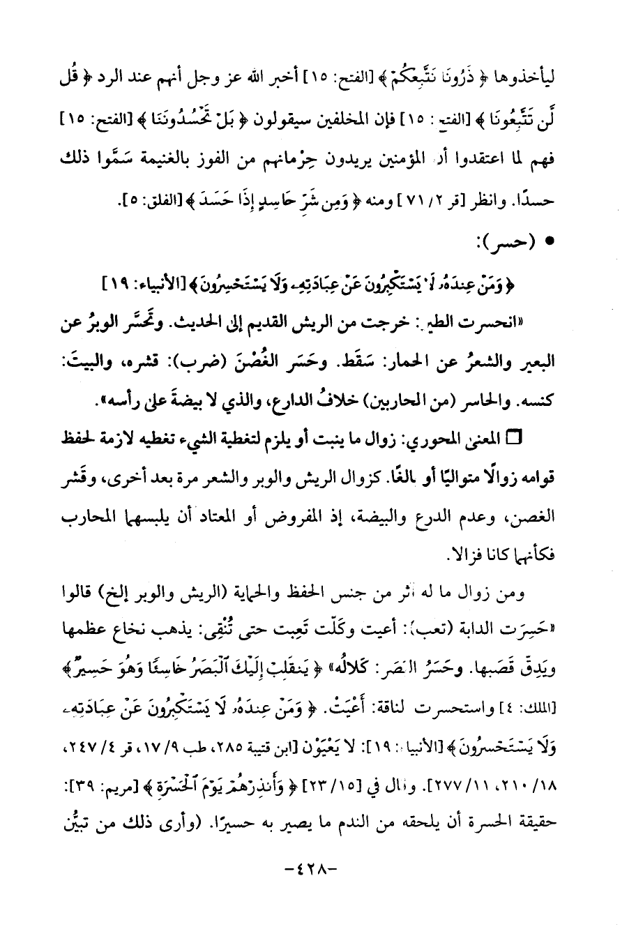ومن زوال ما له أثر من جنس الحفظ والحماية (الريش والوبر إلخ) قالوا "حَسرَت الدابة (تعب): أعيت وكَلّت تَعِبت حتى تُنْقِى: يذهب نخاع عظمها ويَدِق قَصَبها. وحَسَرُ البصَر: كَلالُه " {يَنْقَلِبْ إِلَيْكَ الْبَصَرُ خَاسِئًا وَهُوَ حَسِيرٌ} [الملك: 4] واستحسرت لناقة: أَعْيَتْ. {وَمَنْ عِنْدَهُ لَا يَسْتَكْبِرُونَ عَنْ عِبَادَتِهِ وَلَا يَسْتَحْسِرُونَ} [الأنبياء: 19]: لا يَعْيَوْن [ابن قتيبة 285، طب 9/ 17، قر 4/ 247، 18/ 210، 11/ 277، وقال في [5 1/ 23] {وَأَنْذِرْهُمْ يَوْمَ الْحَسْرَةِ} [مريم: 39]: حقيقة الحسرة أن يلحقه من الندم ما يصير به حسيرًا. (وأرى ذلك من تبين
