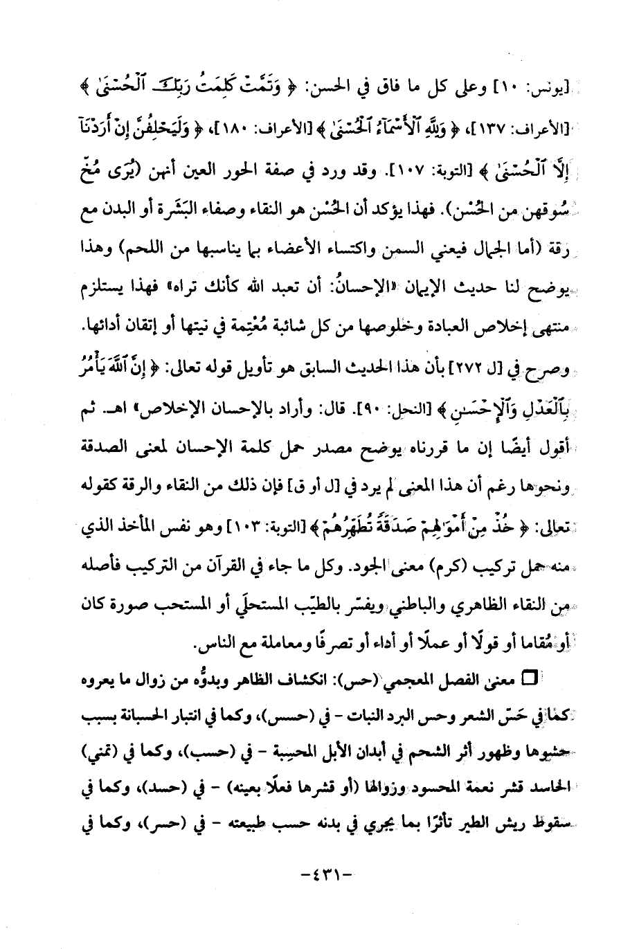 [يونس: 10] وعلى كل ما فاق في الحسن: {وَتَمَّتْ كَلِمَتُ رَبِّكَ الْحُسْنَى} [الأعراف: 137]، {وَلِلَّهِ الْأَسْمَاءُ الْحُسْنَى} [الأعراف: 180]، {وَلَيَحْلِفُنَّ إِنْ أَرَدْنَا إِلَّا الْحُسْنَى} [التوبة: 107]. وقد ورد في صفة الحور العين أنهن (يرى مُخّ سُوقهن منْ الحسن). فهذا يؤكد أن الحسن هو النقاء وصفاء البَشَرة أو البدن مع رقة (أما الجمال فيعني السمن واكتساء الأعضاء بما يناسبها من اللحم) وهذا يوضح لنا حديث الإيمان "الإحسانُ: أن تعبد الله كأنك تراه "فهذا يستلزم منتهى إخلاص العبادة وخلوصها من كل شائبة مُعتِمة في نيتها أو إتقان أدائها. وصرح في [ل 272] بأن هذا الحديث السابق هو تأويل قوله تعالى: {إِنَّ اللَّهَ يَأْمُرُ بِالْعَدْلِ وَالْإِحْسَانِ} [النحل: 90]. قال: وأراد بالإحسان الإخلاص "اه. ثم أقولْ أيضًا إن ما قررناه يوضح مصدر حمل كلمة الإحسان لمعنى الصدقة ونحوها رغم أن هذا المعنى لم يرد في [ل أو ق] فإن ذلك من النقاء والرقة كقوله تعالى: {خُذْ مِنْ أَمْوَالِهِمْ صَدَقَةً تُطَهِّرُهُمْ} [التوبة: 103] وهو نفس المأخذ الذي منه حمل تركيب (كرم) معنى الجود. وكل ما جاء في القرآن من التركيب فأصله من التقاء الظاهري والباطني ويفسّر بالطيّب المستحلَي أو المستحب صورة كان أو مُقاما أو قولًا أو عملًا أو أداء أو تصرفًا ومعاملة مع الناس.