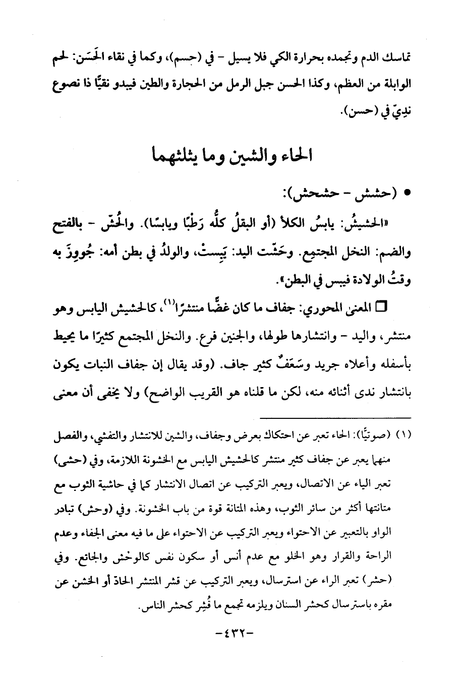 (¬1) (صوتيًّا): الحاء تعبر عن احتكاك بعرض وجفاف، والشين للانتشار والتفشي، والفصل منهما يعبر عن جفاف كثير منتشر كالحشيش اليابس مع الخشونة اللازمة، وفي (حشى) تعبر الياء عن الاتصال، ويعبر التركيب عن اتصال الانتشار كما في حاشية الثوب مع متانتها أكثر من سائر الثوب، وهذه المتانة قوة من باب الخشونة. وفي (وحش) تبادر الواو بالتعبير عن الاحتواء ويعبر التركيب عن الاحتواء علي ما فيه معنى الجفاء وعدم الراحة والقرار وهو الخلو مع عدم أنس أو سكون نفس كالوحش والجائع. وفي (حشر) تعبر الراء عن استرسال، ويعبر التركيب عن قشر المنتشر الحادّ أو الخشن عن مقره باسترسال كحشر السنان ويلزمه تجمع ما قُشر كحشر الناس.