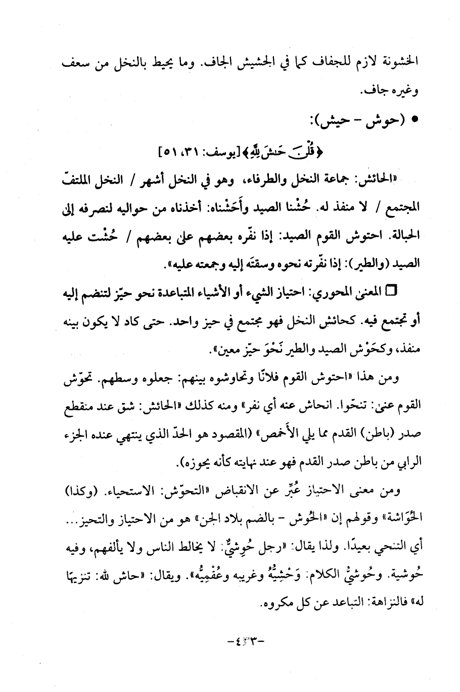 Qاحتياز الشيء أو الأشياء المتباعدة نحو حيّز لتنضم اليه أو تجتمع فيه. كحائش النخل فهو مجتمع فى حيز واحد. حتى كاد لا يكون بينه منفذ، وكحَوش الصيد والطير نَحْوَ حيّز معين ".