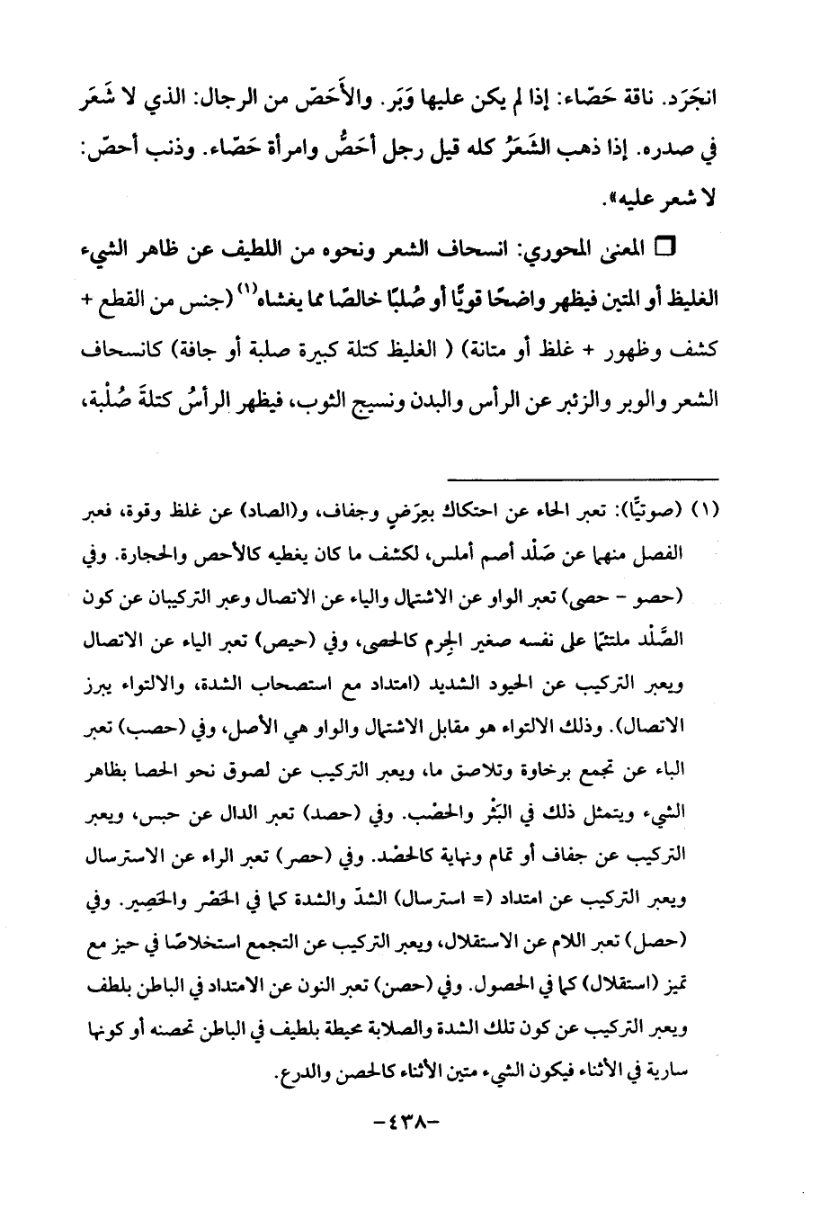 (¬1) (صوتيًا): تعبر الحاء عن احتكاك بعِرَض وجفاف، و (الصاد) عن غلظ وقوة، فحبر الفصل منهما عن صَلد أصم أملس، لكشف ما كان يغطيه كالأحص والحجارة. وفي (حصو - حصى) تعبر الواو عن الاشتمال والياء عن الاتصال وعبر التركيبان عن كون الصّلد ملتئمًا على نفسه صغير الجِرم كالحصى، وفي (حيص) تعبر الياء عن الاتصال ويعبر التركيب عن الحيود الشديد (امتداد مع استصحاب الشدة، والالتواء يبرز الاتصال). وذلك الالتواء هو مقابل الاشتمال والواو هي الأصل، وفي (حصب) تعبر الباء عن تجمع برخاوة وتلاصق ما، ويعبر التركيب عن لصوق نحو الحصا بظاهر الشيء ويتمثل ذلك في البَثْر والحصب. وفي (حصد) تعبر الدال عن حبس، ويعبر التركيب عن جفاف أو تمام ونهاية كالحصد. وفي (حصر) تعبر الراء عن الاسترسال ويعبر التركيب عن امتداد (= استرسال) الشدّ والشدة كما في الحَصر والحَصِير. وفي (حصل) تعبر اللام عن الاستقلال، ويعبر التركيب عن التجمع استخلاصًا في حيز مع تميز (استقلال) كما في الحصول. وفي (حصن) تعبر النون عن الامتداد في الباطن بلطف ويعبر التركيب عن كون تلك الشدة والصلابة محيطة بلطيف في الباطن تحصنه أو كونها سارية في الأثناء فيكون الشيء متين الأثناء كالحصن والدرع.
