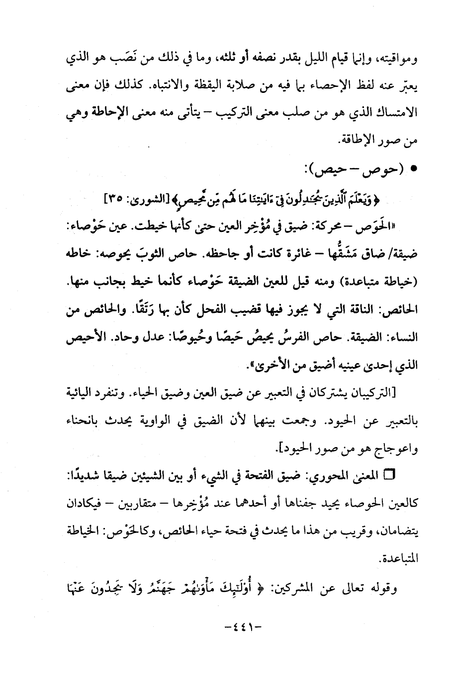 ومواقيته، وإنما قيام الليل بقدر نصفه أو ثلثه، وما في ذلك من نَصَب هو الذي يعتبر عنه لفظ الإحصاء بما فيه من صلابة اليقظة والانتباه. كذلك فإن معنى الامتساك الذي هو من صلب معى التركيب -يتأتى منه معنى الإحاطة وهي من صور الإطاقة.