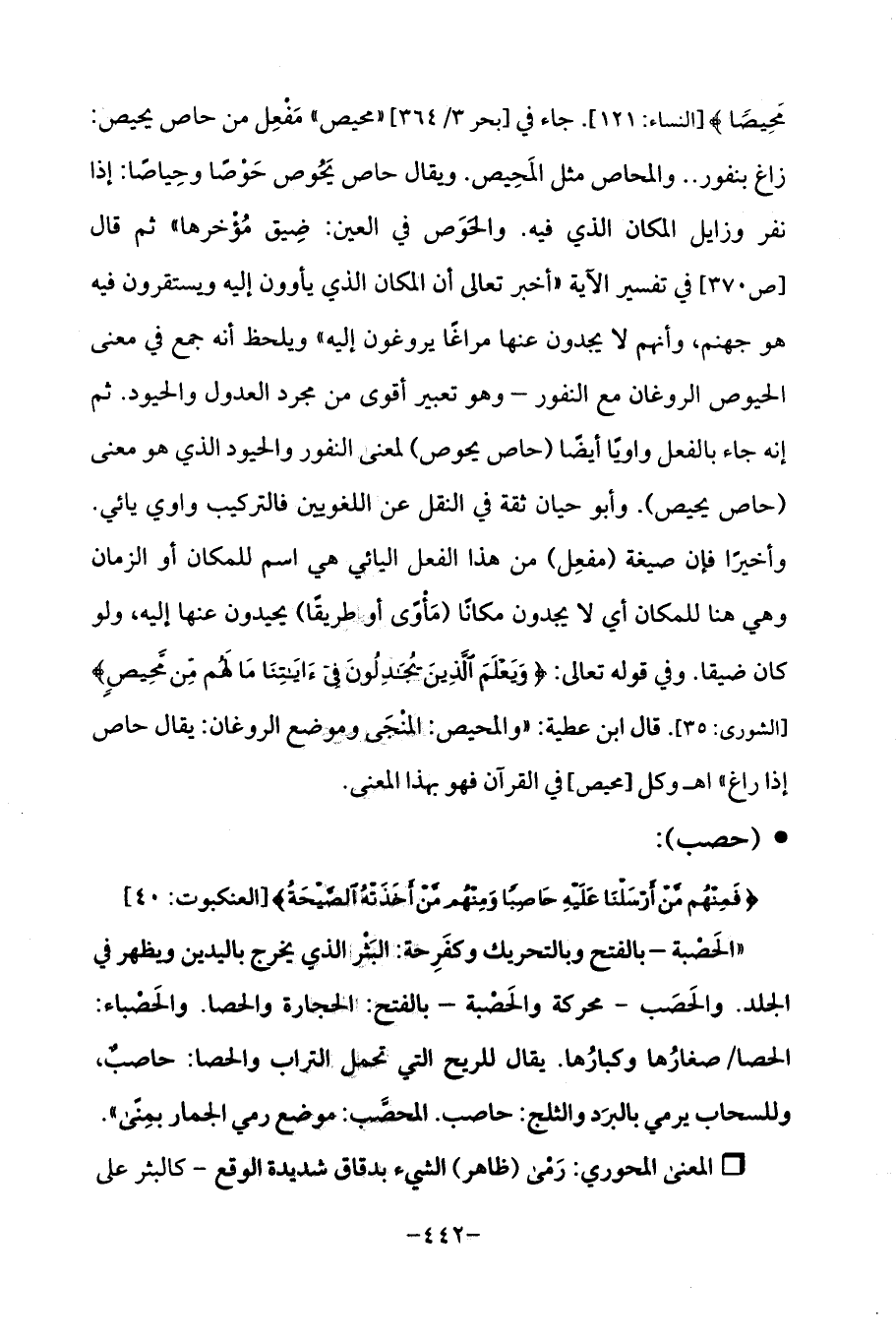 مَحِيصًا (121)} [النساء: 121] جاء في [بحر 3/ 364] "محيص "مَفْعِل من حاص يحيص: زاغ بنفور .. والمحاص مثل المَحِيص. ويقال حاص يَحُوص حَوصًا وحِياصًا: إذا نفر وزايل المكان الذي فيه. والحوَص في العين: ضِيق مُؤْخرها "ثم قال [ص 370] في تفسير الآية (أخبر تعالى أن المكان الذي يأوون إليه ويستقرون فيه هو جهنم، وأنهم لا يجدون عنها مراغًا يروغون إليه "ويلحظ أنه جمع في معنى الحيوص الروغان مع النفور -وهو تعبير أقوى من مجرد العدول والحيود. ثم إنه جاء بالفعل واويًا أيضًا (حاص يحوص) لمعنى النفور والحيود الذي هو معنى (حاص يحيص). وأبو حيان ثقة في النقل عن اللغويين فالتركيب واوي يائي. وأخيرًا فإن صيغة (مفعِل) من هذا الفعل اليائي هي اسم للمكان أو الزمان وهي هنا للمكان أي لا يجدون مكانًا (مَأوًى أو طريقًا) يحيدون. عنها إليه، ولو كان ضيقا. وفي قوله تعالى: {وَيَعْلَمَ الَّذِينَ يُجَادِلُونَ فِي آيَاتِنَا مَا لَهُمْ مِنْ مَحِيصٍ} [الشورى: 35]. قال ابن عطية: (والمحيص: المنْجَى وموضع الروغان: يقال حاص إذا راغ، اه وكل [محيص] في القرآن فهو بهذا المعنى.