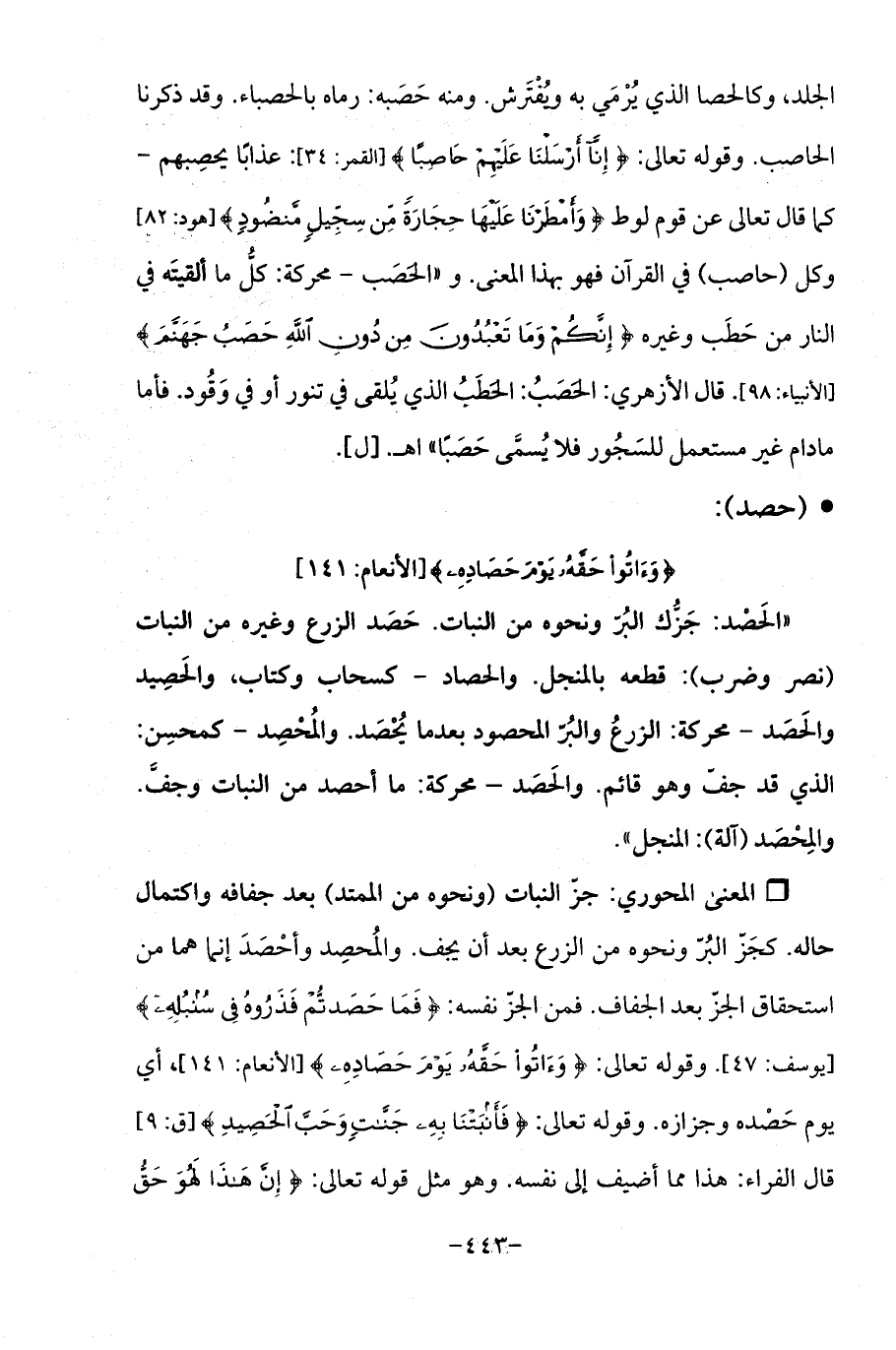 Qجزّ النبات (ونحوه من الممتد) بعد جفافه واكتمال حاله. كجَزّ البُر ونحوه من الزرع بعد أن يجف. والمُحصِد وأحصَدَ إنما هما من استحقاق الجز بعد الجفاف. فمن الجزّ نفسه: {فَمَا حَصَدْتُمْ فَذَرُوهُ فِي سُنْبُلِهِ} [يوسف: 47] وقوله تعالى: {وَآتُوا حَقَّهُ يَوْمَ حَصَادِهِ} [الأنعام: 141]، أي يوم حَصْده وجزازه. وقوله تعالى: {فَأَنْبَتْنَا بِهِ جَنَّاتٍ وَحَبَّ الْحَصِيدِ} [ق: 9] قال الفراء: هذا مما أضيف إلى نفسه. وهو مثل قوله تعالى: {إِنَّ هَذَا لَهُوَ حَقُّ