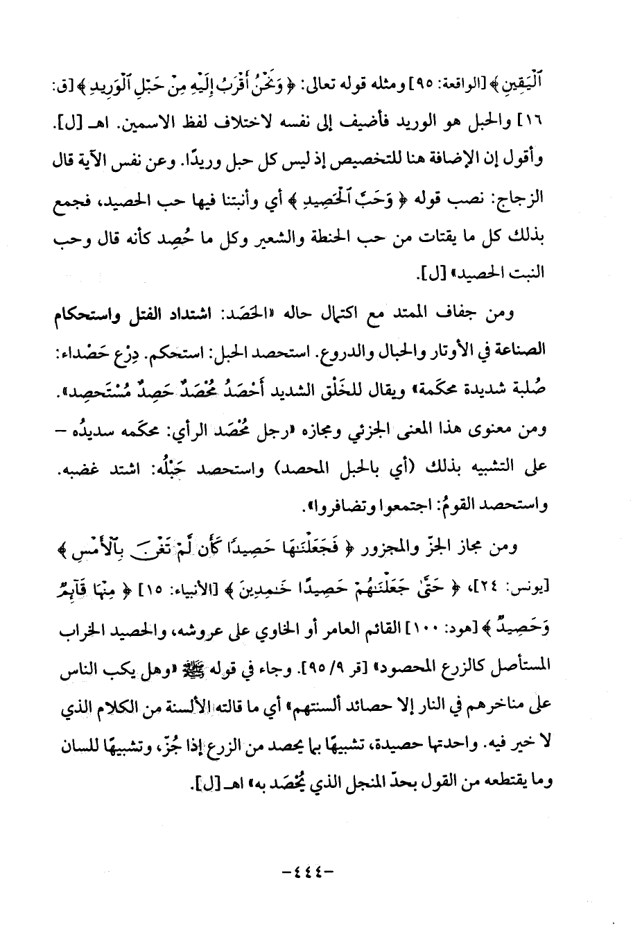 ومن مجاز الجزّ والمجزور {فَجَعَلْنَاهَا حَصِيدًا كَأَنْ لَمْ تَغْنَ بِالْأَمْسِ} [يونس: 24]، {حَتَّى جَعَلْنَاهُمْ حَصِيدًا خَامِدِينَ} [الأنبياء: 15] {مِنْهَا قَائِمٌ وَحَصِيدٌ} [هود: 100] القائم العامر أو الخاوي على عروشه، والحصيد الخراب المستأصل كالزرع المحصود، [قر 9/ 95]. وجاء في قوله - صلى الله عليه وسلم - وهل يكب الناس على مناخرهم في النار إلا حصائد ألسنتهم، أي ما قالته الألسنة من الكلام الذي لا خير فيه. واحدتها حصيدة، تشبيهًا بما يحصد من الزرع إذا جُزّ، وتشبيها للسان وما يقتطعه من القول بحدّ المنجل الذي يُحصَد به "اه [ل].