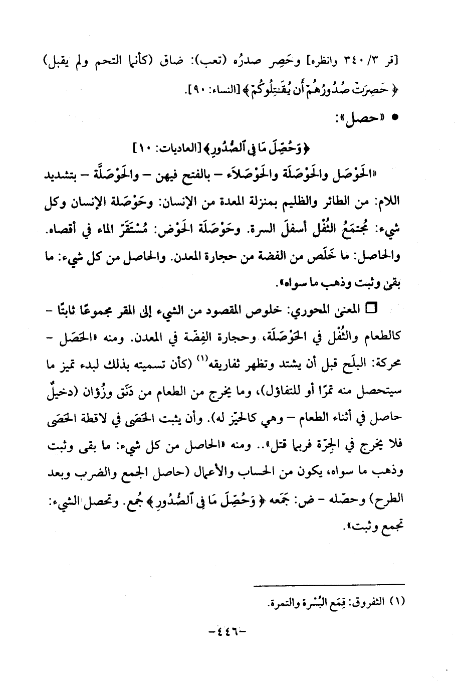 Qخلوص المقصود من الشيء إلى المقر مجموعًا ثابتًا -كالطعام والثُفْل في الحَوصَلَة، وحجارة الفِضة في المعدن. ومنه "الحصَل- محركة: البلَح قبل أن يشتد وتظهر ثفاريقه (¬1) (كأن تسميته بذلك لبدء تميز ما سيتحصل منه تمرًا أو للتفاؤل)، وما يخرج من الطعام من دَنَق وزُؤان (دخيلٌ حاصل في أثناء الطعام -وهي كالحيز له). وأن يثبت الحصَى في لاقطة الحَصَى فلا يخرج في الجِرّة فربما قتل " .. ومنه (الحاصل من كل شيء: ما بقى وثبت وذهب ما سواه، يكون من الحساب والأعمال (حاصل الجمع والضرب وبعد الطرح) وحصّله -ض: جَمَعه {وَحُصِّلَ مَا فِي الصُّدُورِ} جُمع. وتحصل الشيء: تجمع وثبت ".