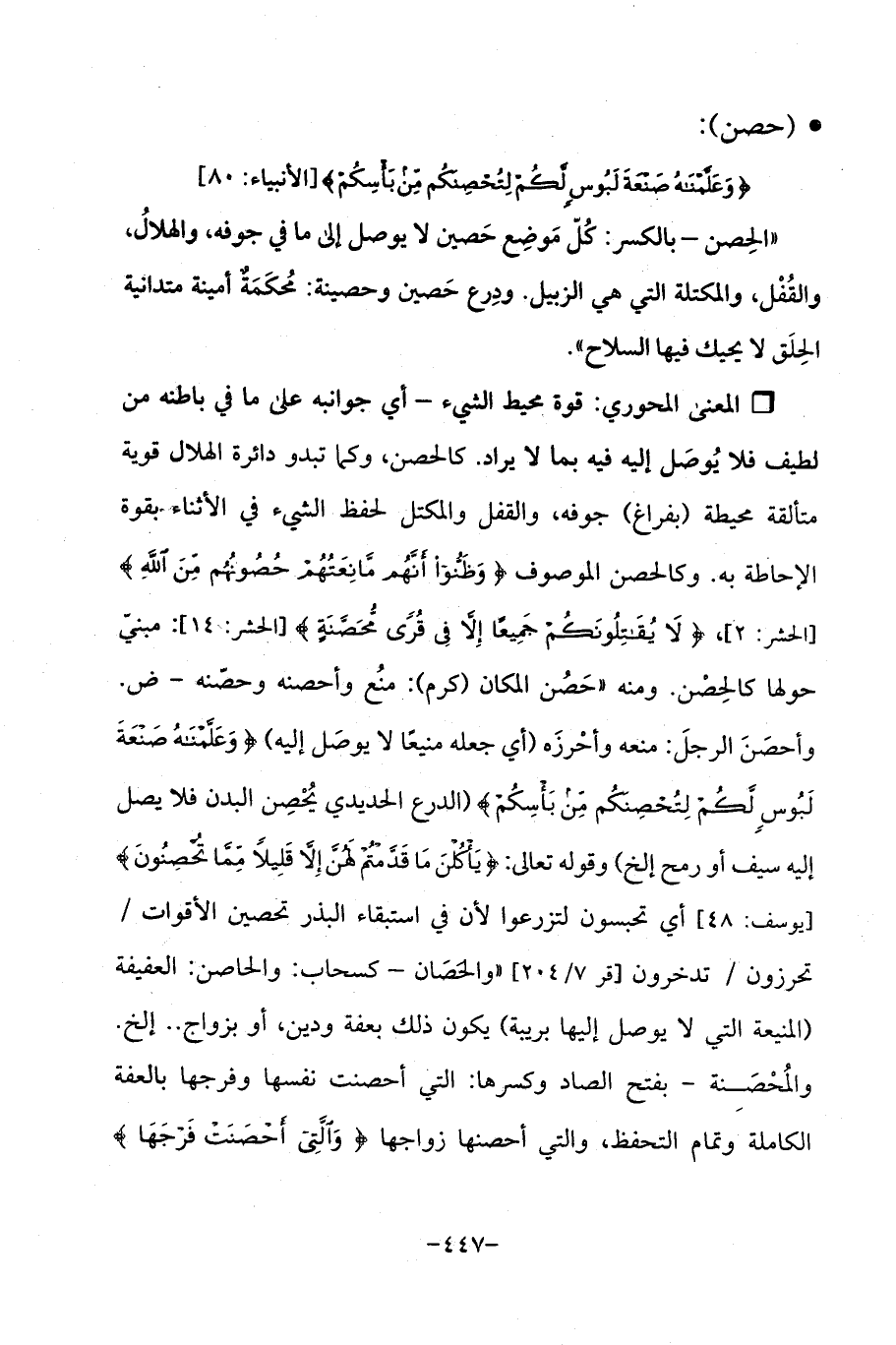 Qقوة محيط الشيء -أي جوانبه على ما في باطنه من لطيف فلا يُوصَل إليه فيه بما لا يراد. كالحصن، وكما تبدو دائرة الهلال قوية متألقة محيطة (بفراغ) جوفه، والقفل والمكتل لحفظ الشيء في الأثناء بقوة الإحاطة به. وكالحصن الموصوف {وَظَنُّوا أَنَّهُمْ مَانِعَتُهُمْ حُصُونُهُمْ مِنَ اللَّهِ} [الحشر: 2]: مبنى حولها كالحِصن. ومنه "حَصُن المكان (كرم): منُع وأحصنه وحصّنه- ض. وأحصنَ الرجلَ: منعه وأحْرزَه (أي جعله منيعًا لا يوصَل إليه) {وَعَلَّمْنَاهُ صَنْعَةَ لَبُوسٍ لَكُمْ لِتُحْصِنَكُمْ مِنْ بَأْسِكُمْ} (الدرع الحديدي يُحْصِن البدن فلا يصل إليه سيف أو رمح إلخ) وقوله تعالى: {يَأْكُلْنَ مَا قَدَّمْتُمْ لَهُنَّ إِلَّا قَلِيلًا مِمَّا تُحْصِنُونَ} [يوسف: 48] أي تحبسون لتزرعوا لأن في استبقاء البذر تحصين الأقوات تحرزون تدخرون [قر 7/ 204] "والحصَان -كسحاب: والحاصن: العفيفة (المنيعة التي لا يوصل إليها بريبة) يكون ذلك بعفة ودين، أو بزواج .. إلخ. والمُحْصِنة -بفتح الصاد وكسرها: التي أحصنت نفسها وفرجها بالعفة الكاملة وتمام التحفظ، والتي أحصنها زواجها {الَّتِي أَحْصَنَتْ فَرْجَهَا}