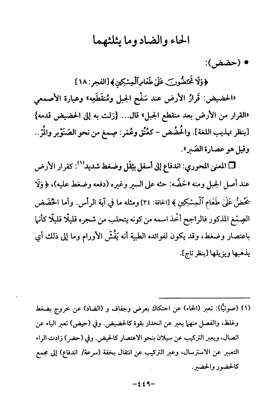 Qاندفاع إلى أسفل بثِقَل وضغط شديد (¬1): كقرار الأرض عند أصل الجبل ومنه "حَضَّه: حثه على السير وغيره (دفعه وضغط عليه)، {وَلَا يَحُضُّ عَلَى طَعَامِ الْمِسْكِينِ} [الحاقة: 34] ومثله ما في آية الرأس. وأما الحُضَض الصِمغ المذكور فالراجح أخْذ اسمه من كونه يتحلب من شجره قليلًا قليلًا كأنما باعصار وضغط، وقد يكون لفوائده الطبية أنه يَفُش الأورام وما إلى ذلك أي يذهبها ويزيلها [ينظر تاج].