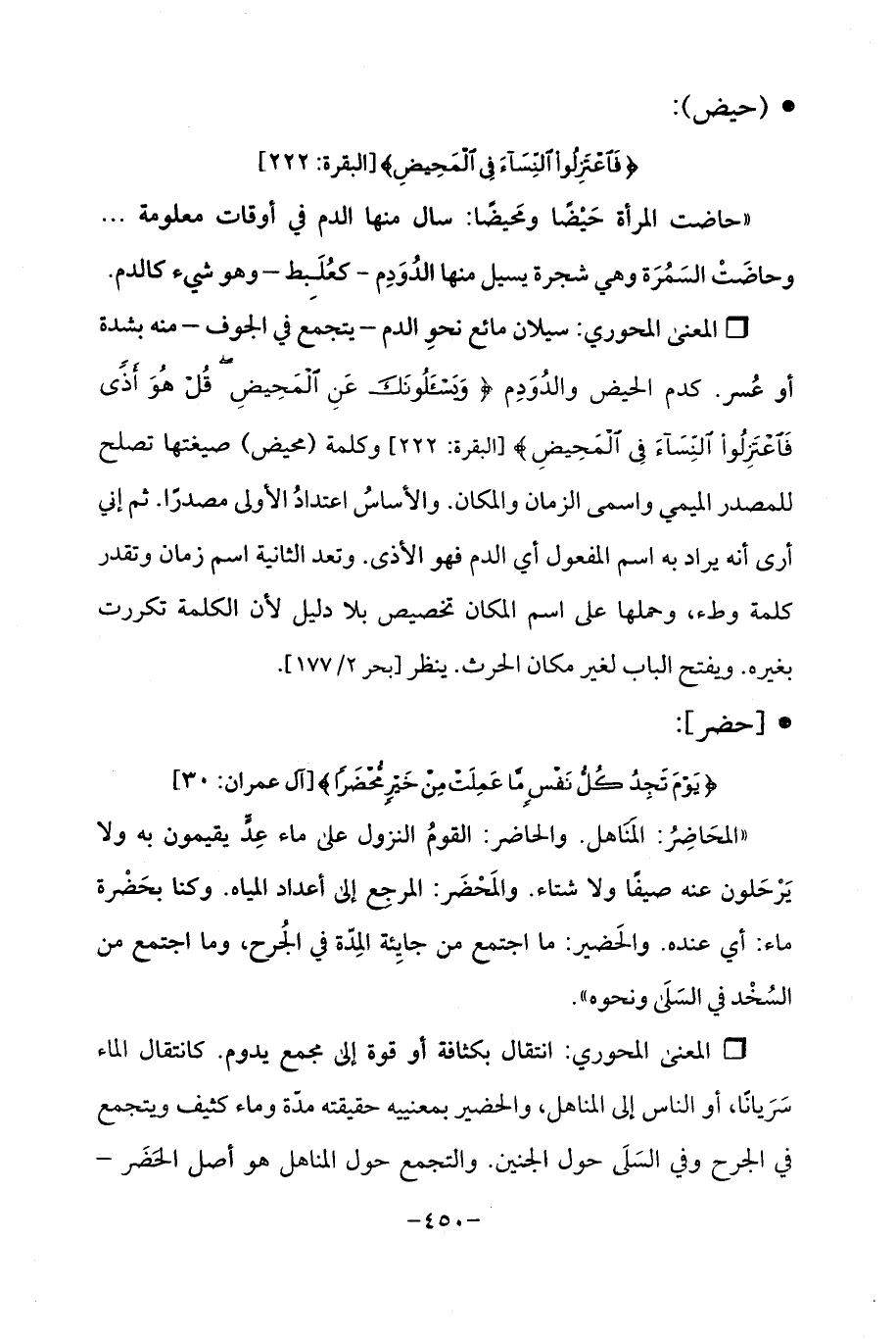 Qسيلان مائع نحوِ الدم -يتجمع في الجوف- منه بشدة أو عُسر. كدم الحيض والدُوَدِم {وَيَسْأَلُونَكَ عَنِ الْمَحِيضِ قُلْ هُوَ أَذًى فَاعْتَزِلُوا النِّسَاءَ فِي الْمَحِيضِ} [البقرة: 222] وكلمة (محيض) صيغتها تصلح للمصدر الميمي واسمى الزمان والمكان. والأساس اعتدادُ الأولى مصدرًا. ثم إني أرى أنه يراد به اسم المفعول أي الدم فهو الأذى. وتعد الثانية اسم زمان وتقدر كلمة وطء، وحملها على اسم المكان تخصيص بلا دليل لأن الكلمة تكررت بغيره. ويفتح الباب لغير مكان الحرث. ينظر [بحر 2/ 177].