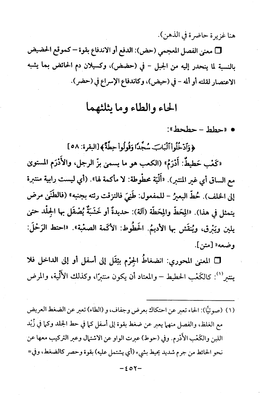 (¬1) (صوتيًّا): الحاء تعبر عن احتكاك بعرض وجفاف، و (الطاء) تعبر عن الضغط العريض مع الغلظ، والفصل منهما يعبر عن ضغط بقوة إلى أسفل كما في حط الجلد وكما في زُبْد اللبن والكَعْب الأَدرم. وفي (حوط) عبرت الواو عن الاشتمال وعبر التركيب معها عن نحو الحائط من جرم شديد يحيط بشيء (أي يشتمل عليه) بقوة وحصر كالضغط، وفي=