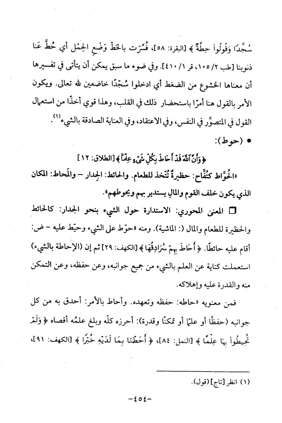 سُجَّدًا وَقُولُوا حِطَّةٌ} [البقرة: 58]، فُستَرَت بالحَطّ وَضْعِ الحِمل أي حُطَّ عَنا ذنوبنا [طب 2/ 105، قر 1/ 410]. وفي ضوء ما سبق يمكن أن يتأتى في تفسيرها أن معناها الخشوع من الضغط أي ادخلوا سُجّدًا خاضعين لله تعالى. ويكون الأمر بالقول هنا أمرًا باستحضار ذلك في القلب، وهذا قوي أخذًا من استعمال القول في المتصوَّر في النفس، وفي الاعتقاد، وفي العناية الصادقة بالشيء (¬1).