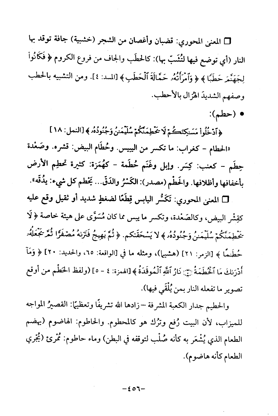 {ادْخُلُوا مَسَاكِنَكُمْ لَا يَحْطِمَنَّكُمْ سُلَيْمَانُ وَجُنُودُهُ} [النمل: 18] "الحطام -كغراب: ما تكسر من اليبيس. وحُطَام البيض: قشره. وصَعْدة حِطَم -كعنب: كِسَر. وإبل وغَنَم حُطَمة -كهُمَزة: كثيرة تحطِم الأرض بأخفافها وأظلافها. والحَطْم (مصدر): الكَسْرُ والدَقّ ... يَحْطم كل شيء: يدُقّه ".