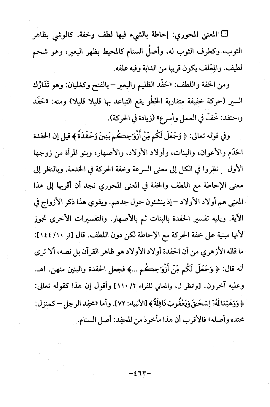 وفي قوله تعالى: {وَجَعَلَ لَكُمْ مِنْ أَزْوَاجِكُمْ بَنِينَ وَحَفَدَةً} قيل إن الحفدة الخدَم والأعوان، والبنات، وأولاد الأولاد، والأصهار، وبنو المرأة من زوجها الأول -نظروا في الكل إلى معنى السرعة وخفة الحركة في الخدمة. وبالنظر إلى معنى الإحاطة مع اللطف والخفة في المعنى المحوري نجد أن أقربها إلى هذا المعنى هم أولاد الأولاد- إذ ينشئون حول جدهم. ويقوي هذا ذكر الأزواج في الآية. ويليه تفسير الحفدة بالبنات ثم بالأصهار. والتفسيرات الأخرى تجوز لأنها مبنية على خفة الحركة مع الإحاطة لكن دون اللطف. قال [قر 10/ 144]: ما قاله الأزهري من أن الحفدة أولاد الأولاد هو ظاهر القرآن بل نصه، ألا ترى أنه قال: {وَجَعَلَ لَكُمْ مِنْ أَزْوَاجِكُمْ ...} فجعل الحفدة والبنين منهن. اه. وعليه آخرون. [وانظر ل، والمعاني للفراء 2/ 110] وأقول إن هذا كقوله تعالى: {وَوَهَبْنَا لَهُ إِسْحَاقَ وَيَعْقُوبَ نَافِلَةً} [الأنبياء: 72] وأما "محمد الرجل -كمنزل: محتده وأصله "فالأقرب أن هذا مأخوذ من المحفِد: أصل السنام.