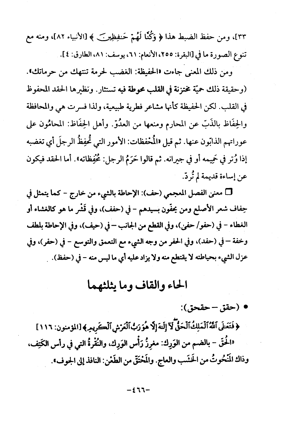 ° معنى الفصل المعجمي (حف): الإحاطة بالشئ من خارج -كما يتمثل في حِفاف شعر الأصلع ومن يحفون بسيدهم -في (حفف)، وفي قَشر ما هو كالغشاء أو الغطاء -في (حفو/ حفى)، وفي القطع من الجانب -في (حيف)، وفي الإحاطة بلطف وخفة -في (حفد)، وفي الحفر من وجه الشيء مع التعمق والتوسع -في (حفر)، وفي عزل الشيء بحياطته لا يقتطع منه ولا يزاد عليه أي ما ليس منه في (حفظ).