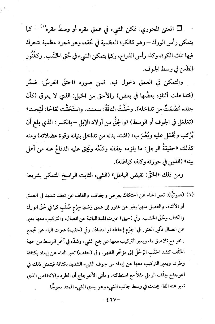 (¬1) (صوتيًّا): تعبر الحاء عن احتكاك بعرض وجفاف، والقاف عن تعقد شديد في العمق أو الأثناء، والفصل منهما يعبر عن غثور إلى عمق وَسطِ جِرمٍ صُلْبٍ كما في حُق الورك والكتف وحُقّ الخشب. وفي (حيق) عبرت المدة اليائية عن اتصال، والتركيب معها يعبر عن اتصال تأثير الغئور في الجِزم إحاطة أو امتدادًا. وفي (حقب) عبرت الباء عن تجمع رخو مع تلاصق ما، ويعبر التركيب معها عن جمع الشيء وشدّه في آخر الوسط من جهة الخَلف كشد الحقَبِ الرَحْلَ إلى مؤخّر الظهر. وفي (حقف) تعبر الفاء عن إبعاد بكثافة وطرد، ويعبر التركيب معها عن إبعاد من جوف الشيء الشديد بكثافة فيتمثل ذلك في اعوجاج حِقْف الرمل مثلا مع استطالته. ومأتى الأعوجاج ان الطرد والانتقاص الذي تعبر عنه الفاء يحدث في وسط جانب الشيء وهو يبدي الشيء الممتد معوجًّا.