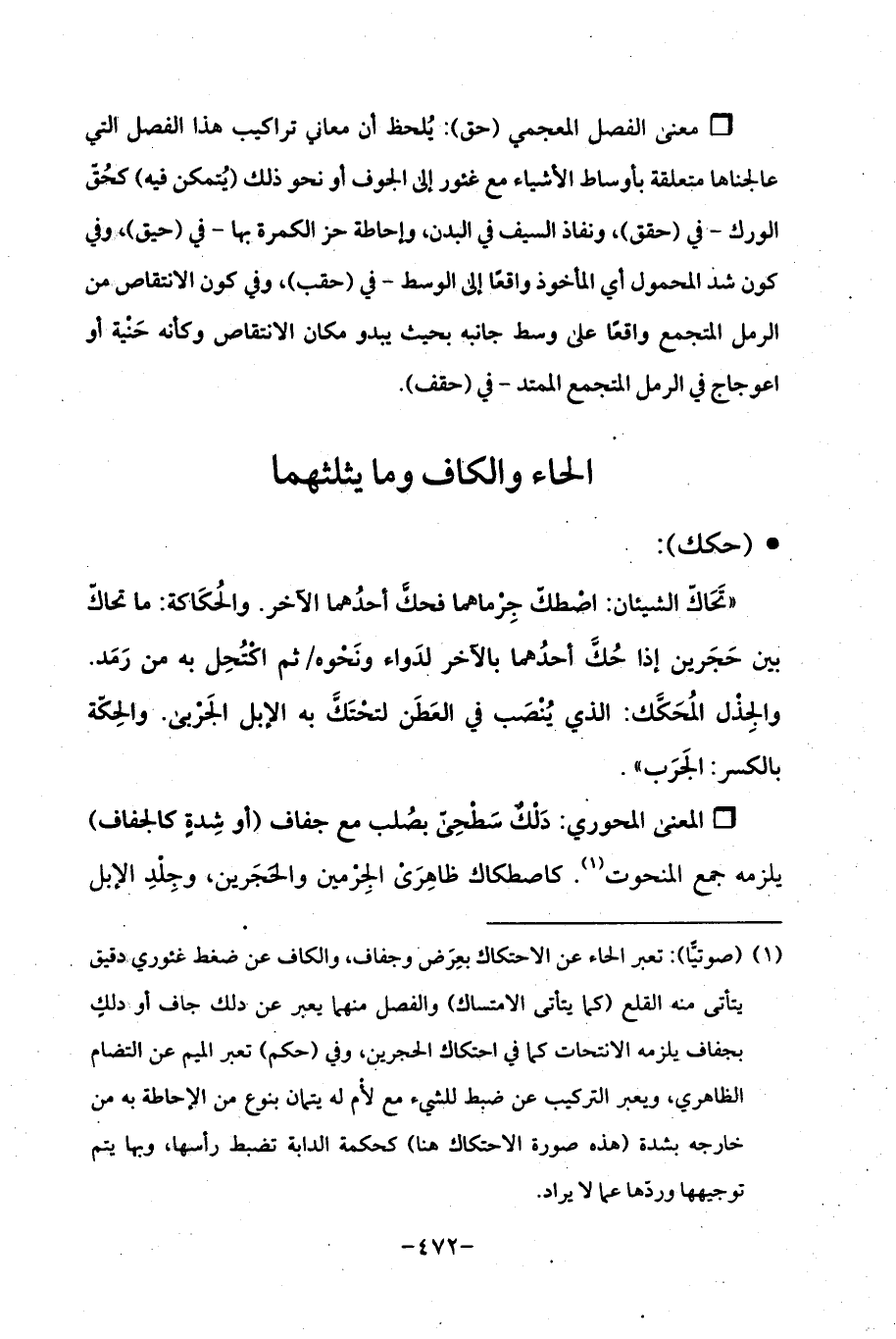 (¬1) (صوتيًا): تعبر الحاء عن الاحتكاك بعِرَض وجفاف، والكاف عن ضغط عثوري دقيق يتأتى منه القلع (كما يتأتى الامتساك) والفصل منهما يعبر عن ذلك جاف أو دلكٍ بجفاف يلزمه الانتحات كما في احتكاك الحجرين، وفي (حكم) تعبر الميم عن التضام الظاهري، ويعبر التركيب عن ضبط للشيء مع لأم له يتمان بنوع من الإحاطة به من خارجه بشدة (هذه صورة الاحتكاك هنا) كحكمة الدابة تضبط رأسها، وبها يتم توجيهها وردّها عما لا يراد.