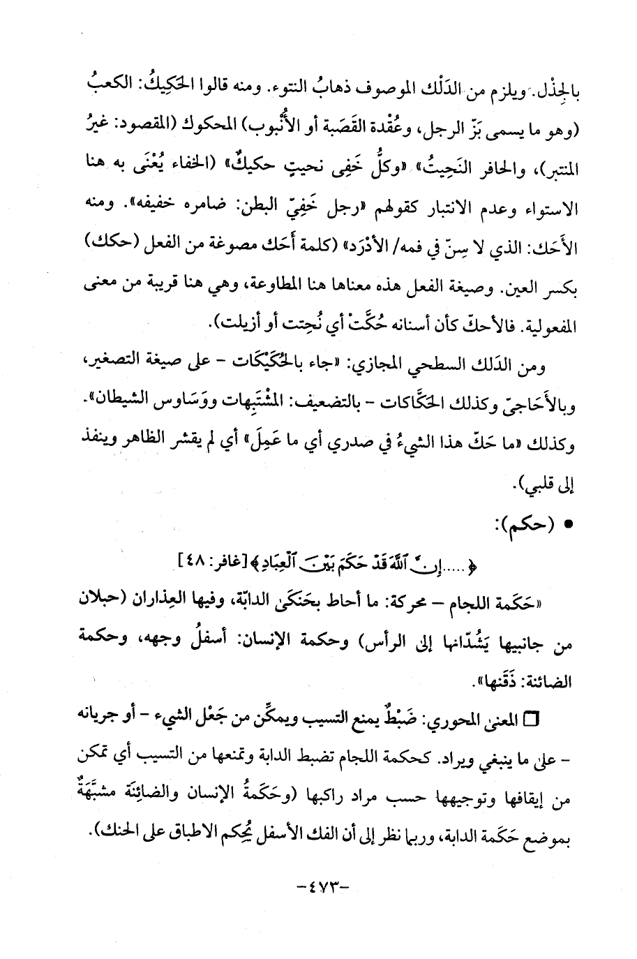 Qضَبْطٌ يمنع التسيب ويمكّن من جَعْل الشيء -أو جريانه- على ما ينبغي ويراد. كحكمة اللجام تضبط الدابة وتمنعها من التسَيب أي تمكن من إيقافها وتوجيهها حسب مراد راكبها (وحَكَمةُ الإنسان والضائِنَة مشتبَّهَةٌ بموضع حَكَمة الدابة، وربما نظر إلى أن الفك الأسفل يُحِكم الاطباق على الحنك).