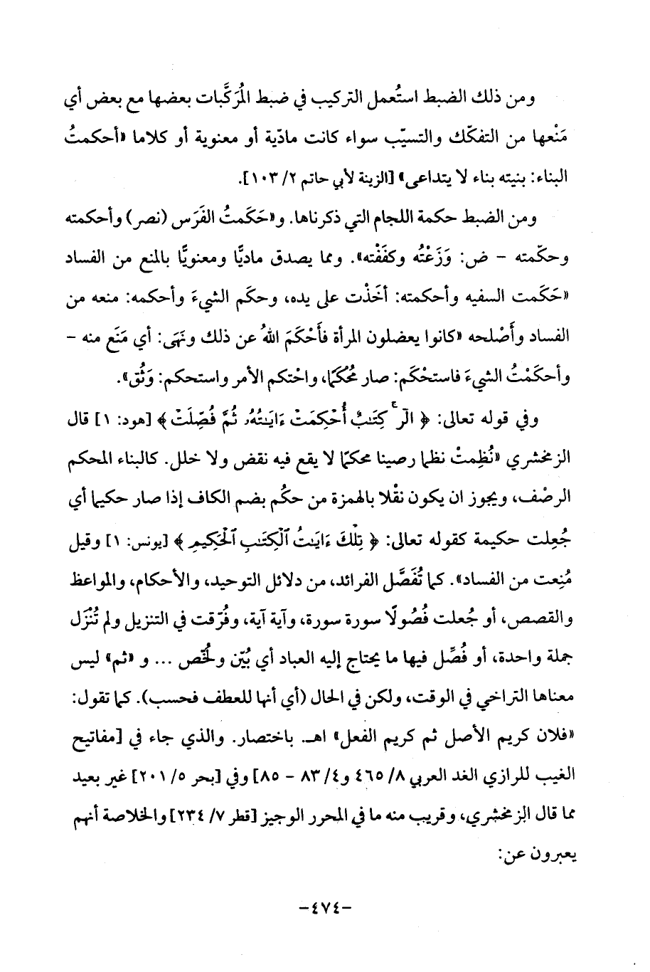 وفي قوله تعالى: {الر كِتَابٌ أُحْكِمَتْ آيَاتُهُ ثُمَّ فُصِّلَتْ} [هود: 1] قال الزمخشري "نُظِمتْ نظما رصينا محكمًا لا يقع فيه نقض ولا خلل. كالبناء المحكم الرصْف، ويجوز ان يكون نقْلا بالهمزة من حكُم بضم الكاف إذا صار حكيما أي جُعِلت حكيمة كقوله تعالى: {تِلْكَ آيَاتُ الْكِتَابِ الْحَكِيمِ} [يونس: 1] وقيل مُنِعت من الفساد ". كما تُفَضل الفرائد، من دلائل التوحيد، والأحكام، والمواعظ والقصص، أو جُعلت فُصُولًا سورة سورة، وآية آية، وفُرّقت في التنزيل ولم تُنزل جملة واحدة، أو فُصِّل فيها ما يحتاج إليه العباد أي بُيّن ولُخّص ... و "ثم "ليس معناها التراخي في الوقت، ولكن في الحال (أي أنها للعطف فحسب). كما تقول: "فلان كريم الأصل ثم كريم الفعل "اه. باختصار. والذي جاء في [مفاتيح الغيب للرازي الغد العربى 8/ 465 و 4/ 83 - 85] وفي [بحر 5/ 201] غير بعيد مما قال الزمخشري، وقريب منه ما في المحرر الوجيز [قطر 7/ 234] والخلاصة أنهم يعبرون عن: