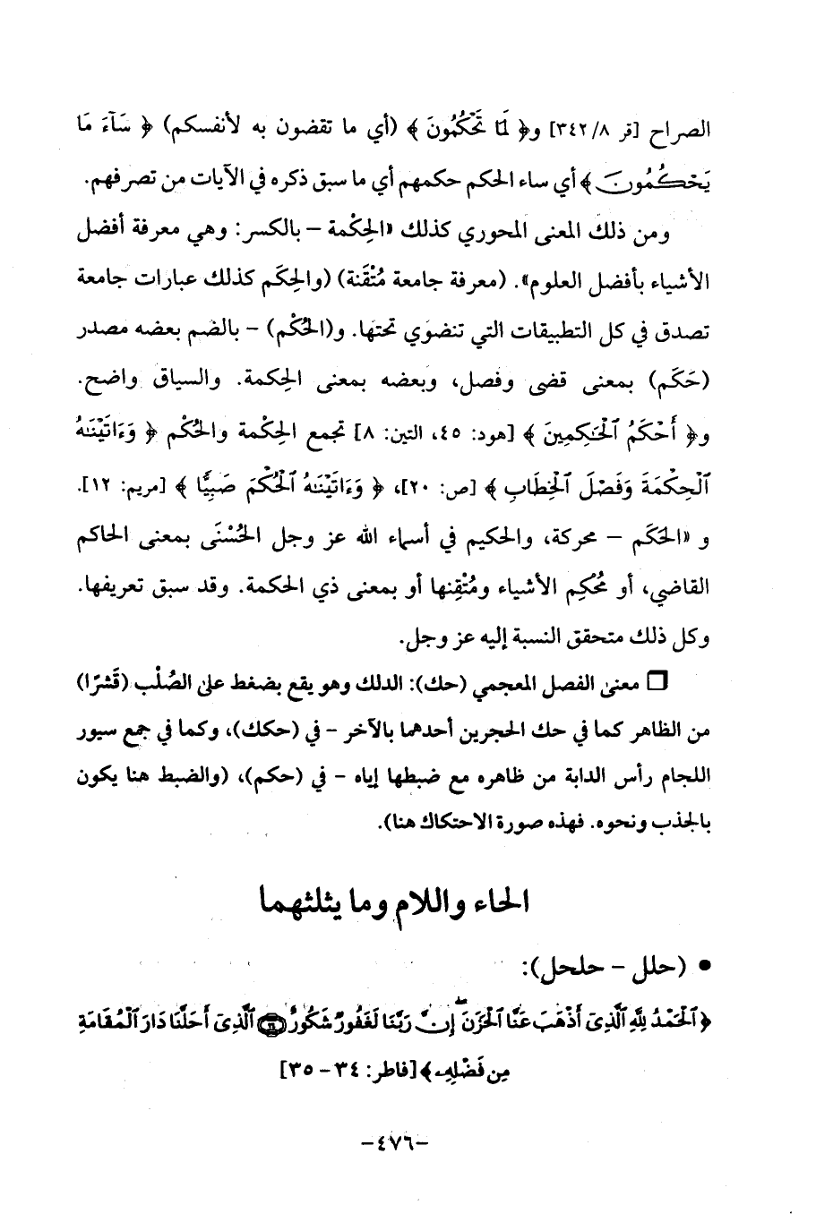 ومن ذلك المعنى المحوري كذلك (الحِكْمة -بالكسر: وهي معرفة أفضل الأشياء بأفضل العلوم ". (معرفة جامعة مُتْقَنة) (والحِكَم كذلك عبارات جامعة تصدق في كل التطبيقات التي تنضوَي تحتها. و (الحُكْم) -بالضم بعضه مصدر (حَكَم) بمعنى قضى وفصل، وبعضه بمعنى الحِكمة. والسياق واضح. و {أَحْكَمُ الْحَاكِمِينَ} [هود: 45، التين: 8] تجمع الحِكمة والحكْم {وَآتَيْنَاهُ الْحِكْمَةَ وَفَصْلَ الْخِطَابِ} [ص: 20]، {وَآتَيْنَاهُ الْحُكْمَ صَبِيًّا} [مريم: 12]. و "الحكَم -محركة، والحكيم في أسماء الله عز وجل الحُسْنَى بمعنى الحاكم القاضي، أو محُكم الأشياء ومُتقِنها أو بمعنى ذي الحكمة. وقد سبق تعريفها. وكل ذلك متحقق النسبة إليه عز وجل.