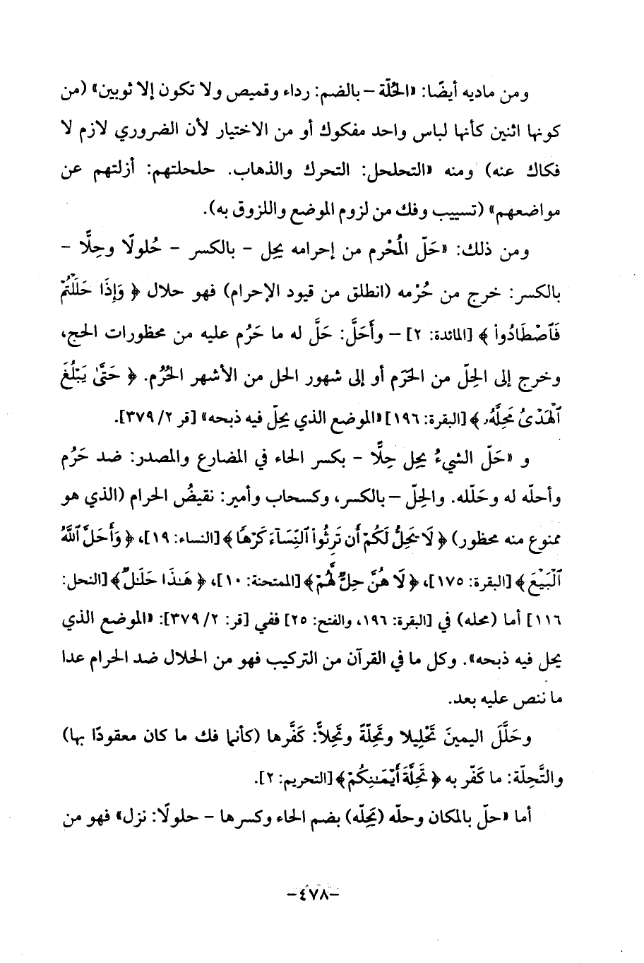 ومن ذلك: "حَل المُحْرم من إحرامه يحل -بالكسر- حُلولًا وحِلًّا -بالكسر: خرج من حُرمه (انطلق من قيود الإحرام) فهو حلال {وَإِذَا حَلَلْتُمْ فَاصْطَادُوا} [المائدة: 2]- وأحَل: حَل له ما حَرُم عليه من محظورات الحج، وخرج إلى الحِلّ من الحَرَم أو إلى شهور الحل من الأشهر الحُرُم. {حَتَّى يَبْلُغَ الْهَدْيُ مَحِلَّهُ} [البقرة: 196] "الموضع الذي يحِل فيه ذبحه " [قر 2/ 379].