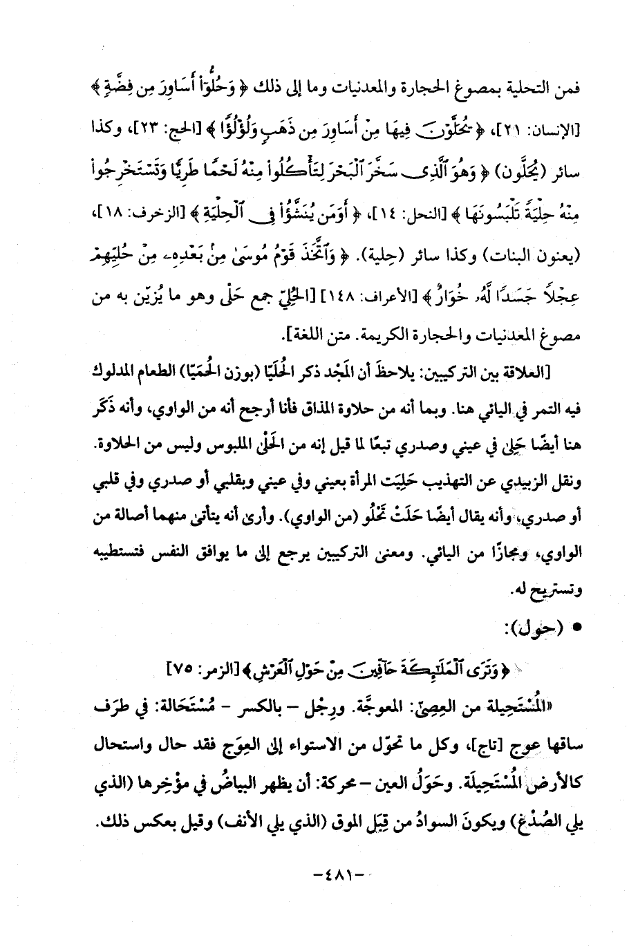 فمن التحلية بمصوغ الحجارة والمعدنيات وما إلى ذلك {وَحُلُّوا أَسَاوِرَ مِنْ فِضَّةٍ} [الإنسان: 21]، {يُحَلَّوْنَ فِيهَا مِنْ أَسَاوِرَ مِنْ ذَهَبٍ وَلُؤْلُؤًا} [الحج: 23]، وكذا سائر (يُحَلَّون) {وَهُوَ الَّذِي سَخَّرَ الْبَحْرَ لِتَأْكُلُوا مِنْهُ لَحْمًا طَرِيًّا وَتَسْتَخْرِجُوا مِنْهُ حِلْيَةً تَلْبَسُونَهَا} [النحل: 14]، {أَوَمَنْ يُنَشَّأُ فِي الْحِلْيَةِ} [الزخرف: 18]، (يعنون البنات) وكذا سائر (حِلية). {وَاتَّخَذَ قَوْمُ مُوسَى مِنْ بَعْدِهِ مِنْ حُلِيِّهِمْ عِجْلًا جَسَدًا لَهُ خُوَارٌ} [الأعراف: 148] [الحُلِيّ جمع حَلْى وهو ما يُزيّن به من مصوغ المعدنيات والحجارة الكريمة. متن اللغة].