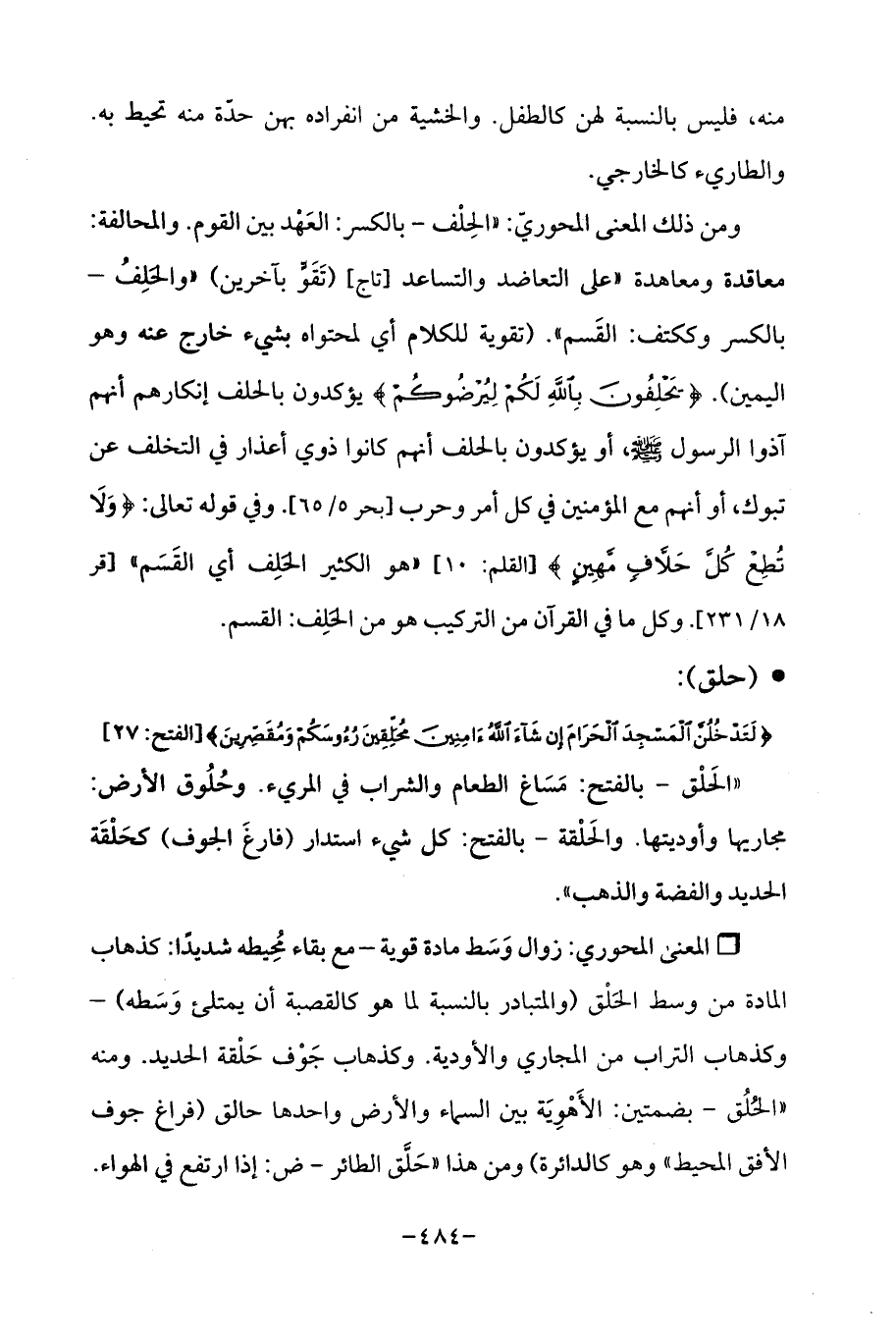 {لَتَدْخُلُنَّ الْمَسْجِدَ الْحَرَامَ إِنْ شَاءَ اللَّهُ آمِنِينَ مُحَلِّقِينَ رُءُوسَكُمْ وَمُقَصِّرِينَ} [الفتح: 27] "الحَلْق -بالفتح: مَسَاغ الطعام والشراب في المريء. وحُلُوق الأرض: مجاريها وأوديتها. والحَلْقة -بالفتح: كل شيء استدار (فارغَ الجوف) كلحَلْقَة الحديد والفضة والذهب ".