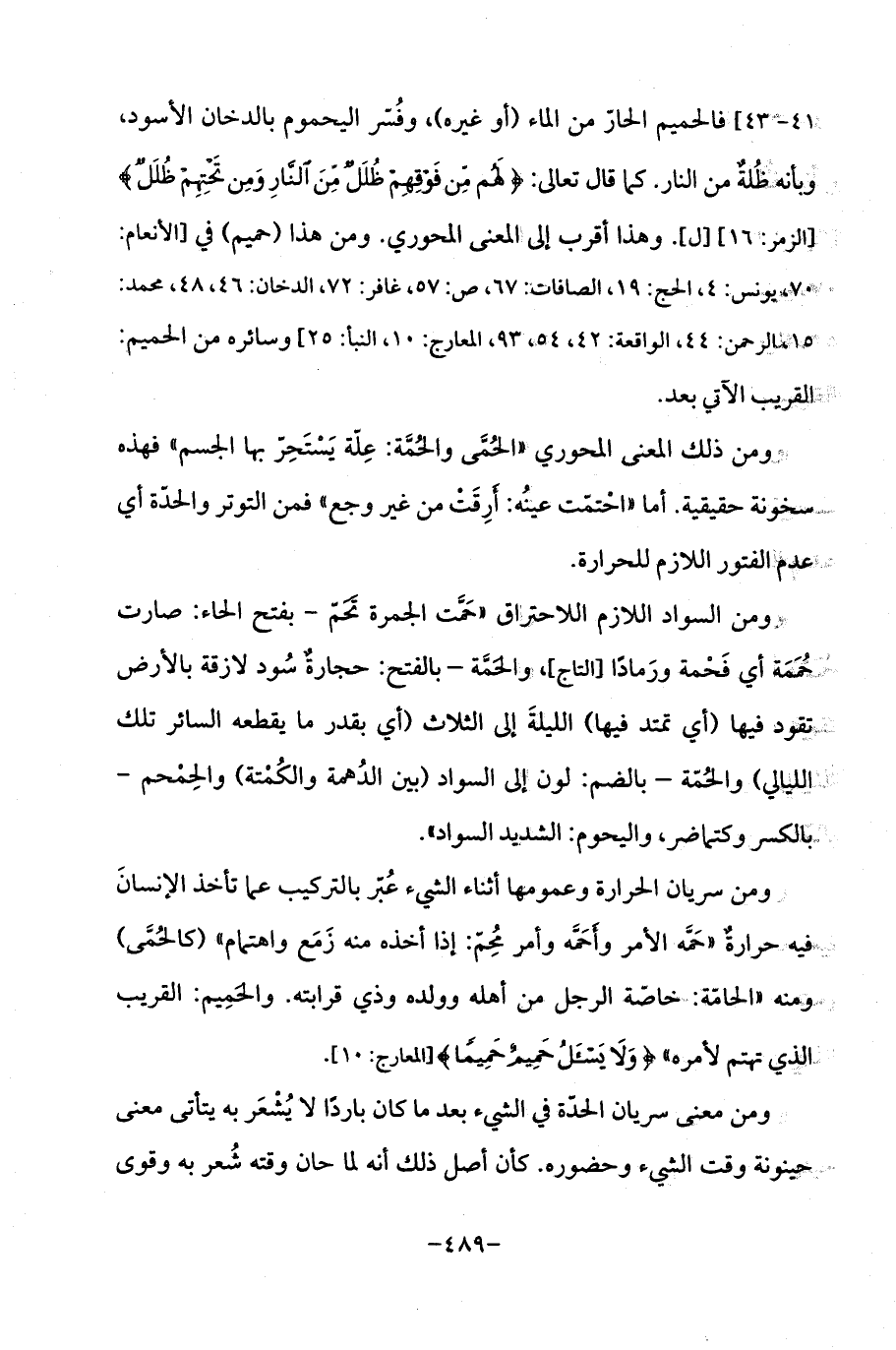 41 - 43] فالحميم الحارّ من الماء (أو غيره)، وفُسّر اليحموم بالدخان الأسود، وبأنه ظُلةٌ من النار. كما قال تعالى: {لَهُمْ مِنْ فَوْقِهِمْ ظُلَلٌ مِنَ النَّارِ وَمِنْ تَحْتِهِمْ ظُلَلٌ} [الزمر: 16] [ل]. وهذا أقرب إلى المعنى المحوري. ومن هذا (حميم) في [الأنعام: 70، يونس: 4، الحج: 19، الصافات: 67، ص: 57، غافر: 72، الدخان: 46، 48، محمد: 15، الرحمن: 44، الواقعة: 42، 54. 93، المعارج: 10، النبأ: 25] وسائره من الحميم: القريب الأتي بعد.