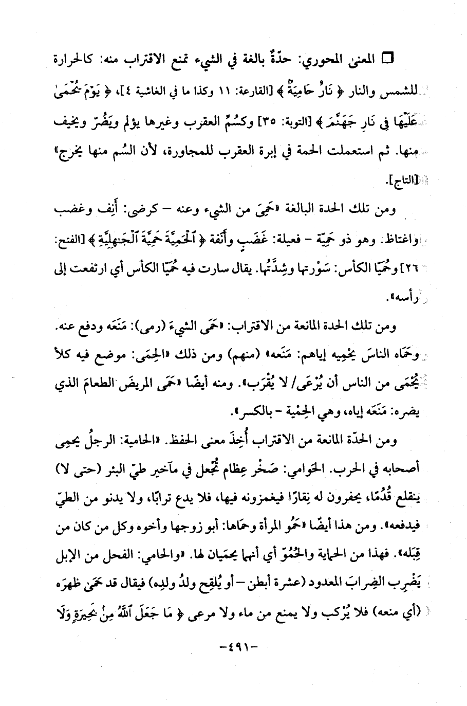 Qحدّة بالغة في الشيء تمنع الاقتراب منه: كالحرارة للشمس والنار {نَارٌ حَامِيَةٌ} [القارعة: 11] وكذا ما في الغاشية 4]، {يَوْمَ يُحْمَى عَلَيْهَا فِي نَارِ جَهَنَّمَ} [التوبة: 35] وكسُمِّ العقرب وغيرها يؤلم وَيضُرّ ويخيف منها. ثم استعملت الحمة في إبرة العقرب للمجاورة، لأن السُم منها يخرج " [التاج].