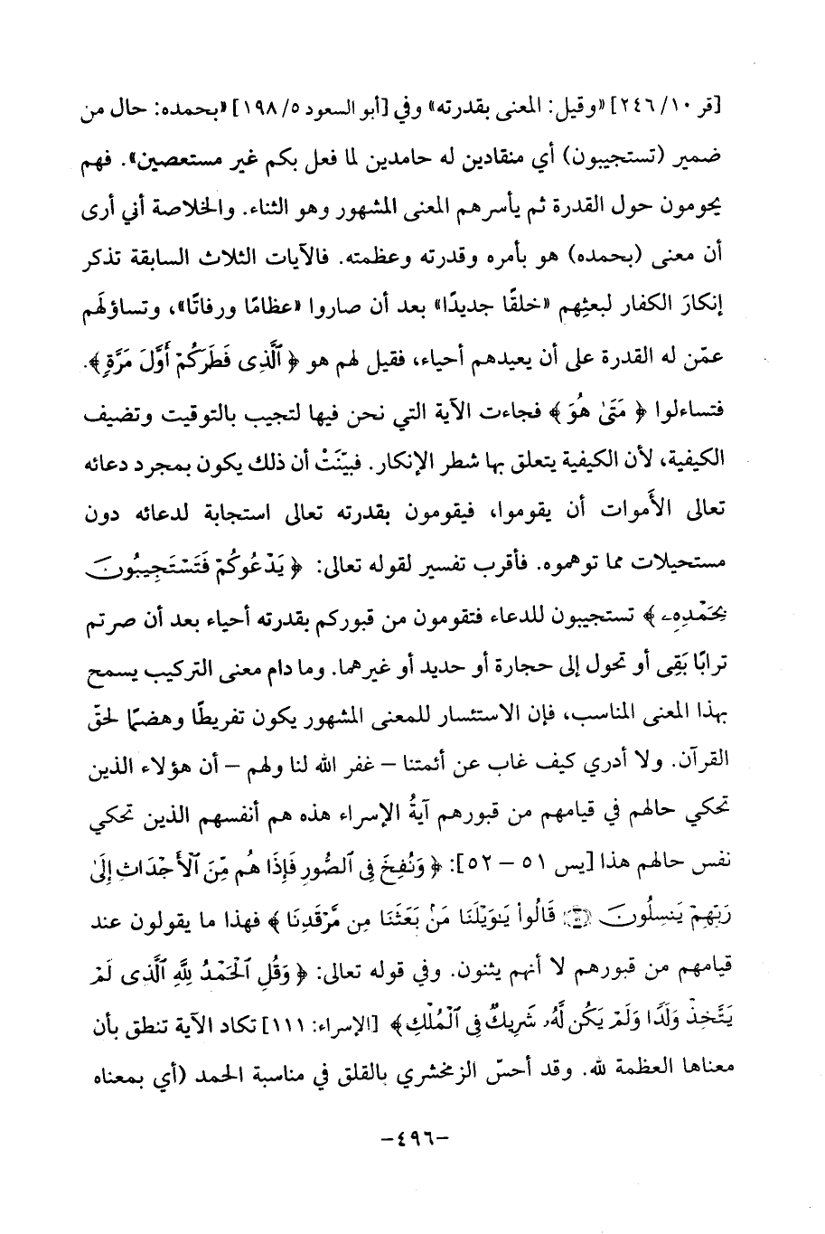 [قر 10/ 246] "وقيل: المعنى بقدرته "وفي [أبو السعود 5/ 198] "بحمده: حال من ضمير (تستجيبون) أي منقادين له حامدين لما فعل بكم غير مستعصين ". فهم يحومون حول القدرة ثم يأسرهم المعنى المشهور وهو الثناء. والخلاصة أني أرى أن معنى (بحمده) هو بأمره وقدرته وعظمته. فالآيات الثلاث السابقة تذكر إنكارَ الكفار لبعثِهم "خلقًا جديدًا "بعد أن صاروا "عظامًا ورفاتًا "، وتساؤلَهم عمّن له القدرة على أن يعيدهم أحياء، فقيل لهم هو {الَّذِي فَطَرَكُمْ أَوَّلَ مَرَّةٍ}. فتساءلوا {مَتَى هُوَ} فجاءت الآية التي نحن فيها لتجيب بالتوقيت وتضيف الكيفية، لأن الكيفية يتعلق بها شطر الإنكار. فبينَتْ أن ذلك يكون بمجرد دعائه تعالى الأَموات أن يقوموا، فيقومون بقدرته تعالى استجابة لدعائه دون مستحيلات مما توهموه. فأقرب تفسير لقوله تعالى: {يَدْعُوكُمْ فَتَسْتَجِيبُونَ بِحَمْدِهِ} تستجيبون للدعاء فتقومون من قبوركم بقدرته أحياء بعد أن صرتم ترابًا بَقِى أو تحول إلى حجارة أو حديد أو غيرهما. وما دام معنى التركيب يسمح بهذا المعنى المناسب، فإن الاستئسار للمعنى المشهور يكون تفريطًا وهضمًا لحق القرآن. ولا أدري كيف غاب عن أئمتنا -غفر الله لنا ولهم- أن هؤلاء الذين تحكي حالهم في قيامهم من قبورهم آيةُ الإسراء هذه هم أنفسهم الذين تحكي نفس حالهم هذا [يس 51 - 52]: {وَنُفِخَ فِي الصُّورِ فَإِذَا هُمْ مِنَ الْأَجْدَاثِ إِلَى رَبِّهِمْ يَنْسِلُونَ (51) قَالُوا يَاوَيْلَنَا مَنْ بَعَثَنَا مِنْ مَرْقَدِنَا} فهذا ما يقولون عند قيامهم من قبورهم لا أنهم يثنون. وفي قوله تعالى: {وَقُلِ الْحَمْدُ لِلَّهِ الَّذِي لَمْ يَتَّخِذْ وَلَدًا وَلَمْ يَكُنْ لَهُ شَرِيكٌ فِي الْمُلْكِ} [الإسراء: 111] تكاد الآية تنطق بأن معناها العظمة لله. وقد أحس الزمخشري بالقلق في مناسبة الحمد (أي بمعناه