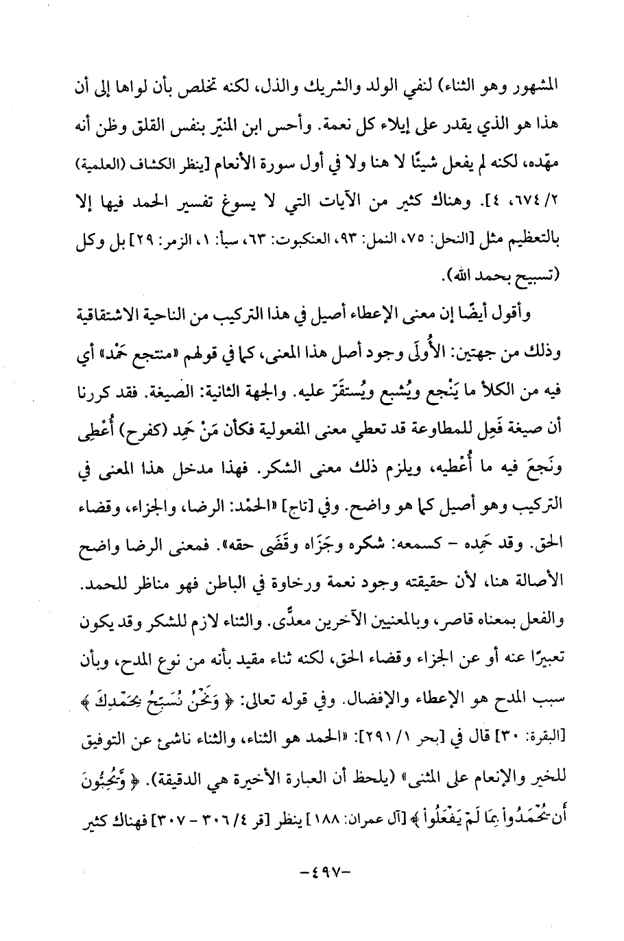 المشهور وهو الثناء) لنفي الولد والشريك والذل، لكنه تخلص بأن لواهما إلى أن هذا هو الذي يقدر على إيلاء كل نعمة. وأحس ابن المنيّر بنفس القلق وظن أنه مهّده، لكنه لم يفعل شيئًا لا هنا ولا في أول سورة الأنعام [ينظر الكشاف (العلمية) 2/ 674، 4]. وهناك كثير من الآيات التي لا يسوغ تفسير الحمد فيها إلا بالتعظيم مثل [النحل: 75، النمل: 93، العنكبوت: 63، سبأ: 1، الزمر: 29] بل وكل (تسبيح بحمد الله).
