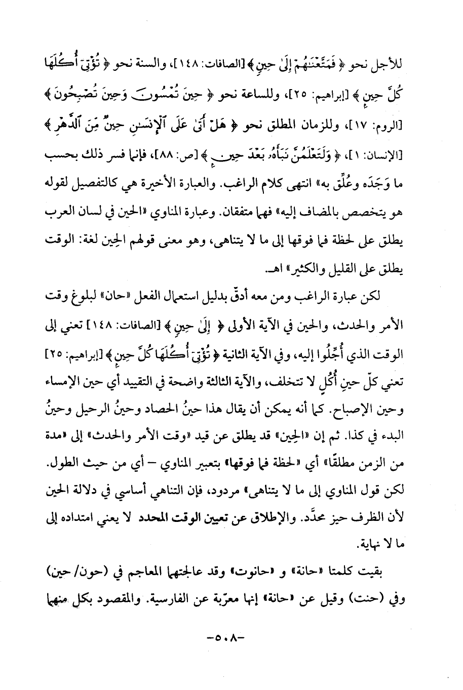 لكن عبارة الراغب ومن معه أدقّ بدليل استعمال الفعل "حان "لبلوغ وقت الأمر والحدث، والحين في الآية الأولى {إِلَى حِينٍ} [الصافات: 148] تعني إلى الوقت الذي أُجِّلُوا إليه، وفي الآية الثانية {تُؤْتِي أُكُلَهَا كُلَّ حِينٍ} [إبراهيم: 25] تعني كلّ حينِ أُكُلٍ لا تتخلف، والآية الثالثة واضحة في التقييد أي حين الإمساء وحين الإصباح. كما أنه يمكن أن يقال هذا حينُ الحصاد وحينُ الرحيل وحينُ البدء في كذا. ثم إن "الحِين "قد يطلق عن قيد "وقت الأمر والحدث "إلى "مدة من الزمن مطلقًا "أي "لحظة فما فوقها "بتعبير المناوي -أي من حيث الطول. لكن قول المناوي إلى ما لا يتناهى "مردود، فإن التناهي أساسي في دلالة الحين لأن الظرف حيز محدَّد. والإطلاق عن تعيين الوقت المحدد لا يعني امتداده إلى ما لا نهاية.