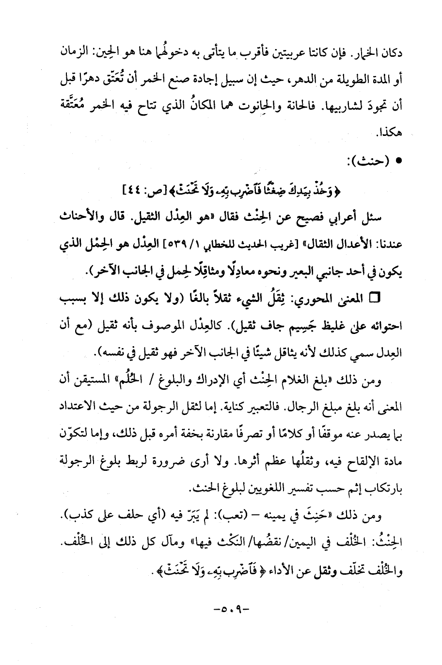 سئل أعرابي فصيح عن الحِنْث فقال "هو العِدْل الثقيل. قال والأحناث عندنا: الأعدال الثقال " [غريب الحديث للخطابي 1/ 539] العِدْل هو الحِمْل الذي يكون في أحد جانبي البعير ونحوه معادِلًا ومثاقِلًا لحِمل في الجانب الآخر).