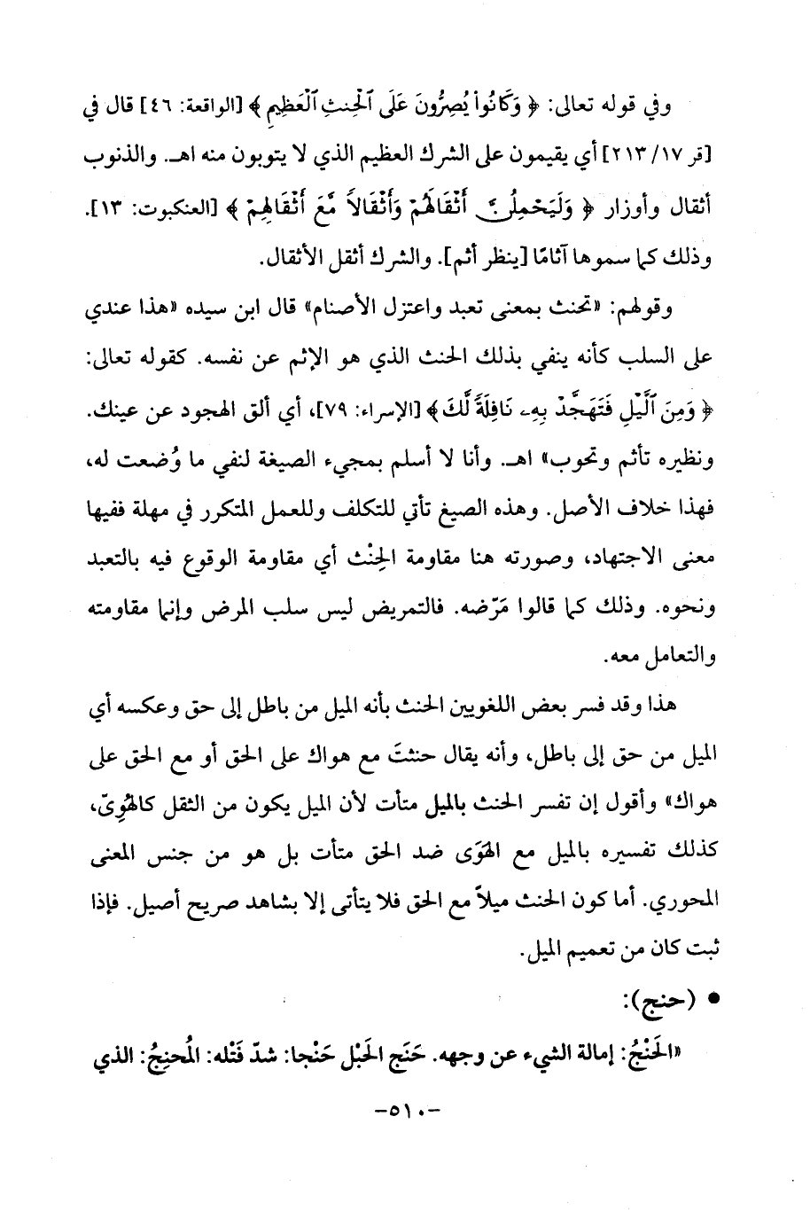 هذا وقد فسر بعض اللغويين الخث بأنه الميل من باطل إلى حق وعكسه أي الميل من حق إلى باطل، وأنه يقال حنثتَ مع هواك على الحق أو مع الحق على هواك "وأقول إن تفسر الحنث بالميل متأت لأن الميل يكون من الثقل كالهُوِىّ، كذلك تفسيره بالميل مع الهَوَى ضد الحق متأت بل هو من جنس المعنى المحوري. أما كون الحنث ميلًا مع الحق فلا يتأتى إلا بشاهد صريح أصيل. فإذا ثبت كان من تعميم الميل.