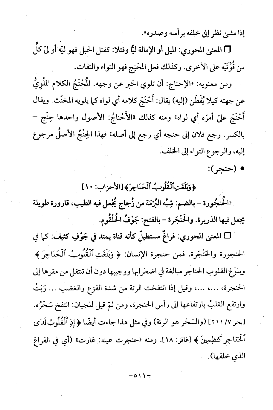 Qفراغٌ مستطيلٌ كأنه قناة يمتد في جَوْفِ كثيف: كما في الحنجورة والحنْجَرة. فمن حنجرة الإنسان: {وَبَلَغَتِ الْقُلُوبُ الْحَنَاجِرَ}. وبلوغ القلوب الحناجر مبالغة في اضطرابها ووجيبها دون أن تنتقل من مقرها إلى الحنجرة، ... ، ... ، وقيل إذا انتفخت الرئة من شدة الفزع والغضب ... رَبَتْ وارتفع القلبُ بارتفاعها إلى رأس الحنجرة، ومن ثمّ قيل للجبان: انتفخ سَحْرُه. [بحر 7/ 211] (والسَحْر هو الرئة) وفي مثل هذا جاءت أيضًا {إِذِ الْقُلُوبُ لَدَى الْحَنَاجِرِ كَاظِمِينَ} [غافر: 18].ومنه "حنجرت عينه: غارت " (أي في الفراغ الذي خلفها).