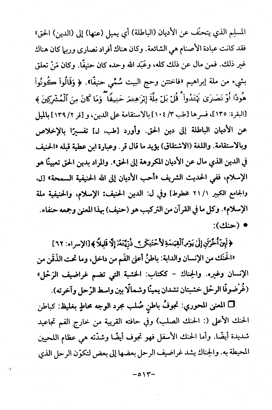 المسلِم الذي يتحنّف عن الأديان (الباطلة) أي يميل (عنها) إلى (الدين) الحق "فقد كانت عبادة الأصنام هي الشائعة. وكان هناك أفراد نصارى وربما كان هناك غير ذلك. فمن مال عن ذلك كله، وعَبَد الله وحده كان حنيفًا. وكان مَنْ تعلق بشيء من ملة إبراهيم "فاختتن وحج البيت سُمِّي حنيفًا ". {وَقَالُوا كُونُوا هُودًا أَوْ نَصَارَى تَهْتَدُوا قُلْ بَلْ مِلَّةَ إِبْرَاهِيمَ حَنِيفًا وَمَا كَانَ مِنَ الْمُشْرِكِينَ} [البقرة: 135]، فسرها [طب 3/ 104] بالاستقامة على الدين، و [قر 2/ 139] بالميل عن الأديان الباطلة إلى دين الحق. وأورد [طب، ل] تفسيرًا بالإخلاص وبالاستقامة. واللغة (الاشتقاق) يؤيد ما قال قر. وعبارة ابن عطية قبله "الحنيف في الدين الذي مال عن الأديان المكروهة إلى الحق ". والمراد بدين الحق تعيينًا هو الإسلام، ففي الحديث الشريف "أحب الأديان إلى الله الحنيفية السمحة " [ل، والجامع الكبير 1/ 21 مخطوط] وفي ل: الدين الحنيف: الإسلام، والحنيفية ملة الإسلام ". وكل ما في القرآن من التركيب هو (حنيف) بهذا المعنى وجمعه حنفاء.
