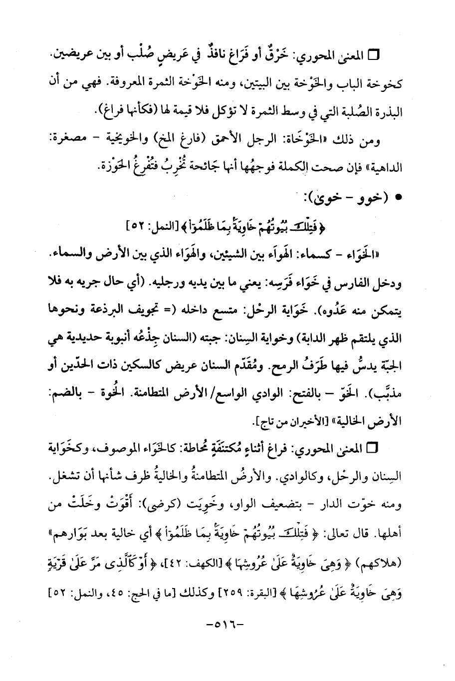 Qفراغ أثناءٍ مُكتنَفَةٍ مُحاطة: كالخَوَاء الموصوف، وكخَوَاية السِنان والرحْل، وكالوادي. والأرضُ المتطامنةُ والخاليةُ ظرف شأنها أن تشغل. ومنه خوّت الدار- بتضعيف الواو، وخَوِيَت (كرضى): أَقْوَتْ وخَلَتْ من أهلها. قال تعالى: {فَتِلْكَ بُيُوتُهُمْ خَاوِيَةً بِمَا ظَلَمُوا} أي خالية بعد بَوَارهم " (هلاكهم) {وَهِيَ خَاوِيَةٌ عَلَى عُرُوشِهَا} [الكهف: 42]، {أَوْ كَالَّذِي مَرَّ عَلَى قَرْيَةٍ وَهِيَ خَاوِيَةٌ عَلَى عُرُوشِهَا} [البقرة: 259] وكذلك [ما في الحج: 45، والنمل: 52]