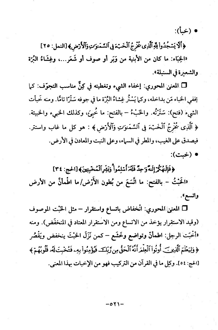 Qانخفاض باتساع واستقرار -مثل الخَبْت الموصوف (وقيد الاستقرار يؤخذ من الاتساع ومن الاستقرار المعتاد في المنخفَض). ومنه "أخْبَت الرجل: اطمأنّ وتواضع وخَشَع -كمن نَزَلَ الخبْتَ ينخفض ويَقْصُر {وَلِيَعْلَمَ الَّذِينَ أُوتُوا الْعِلْمَ أَنَّهُ الْحَقُّ مِنْ رَبِّكَ فَيُؤْمِنُوا بِهِ فَتُخْبِتَ لَهُ قُلُوبُهُمْ} [الحج: 54]: وكل ما في القرآن من التركيب فهو من الإخبات بهذا المعنى.