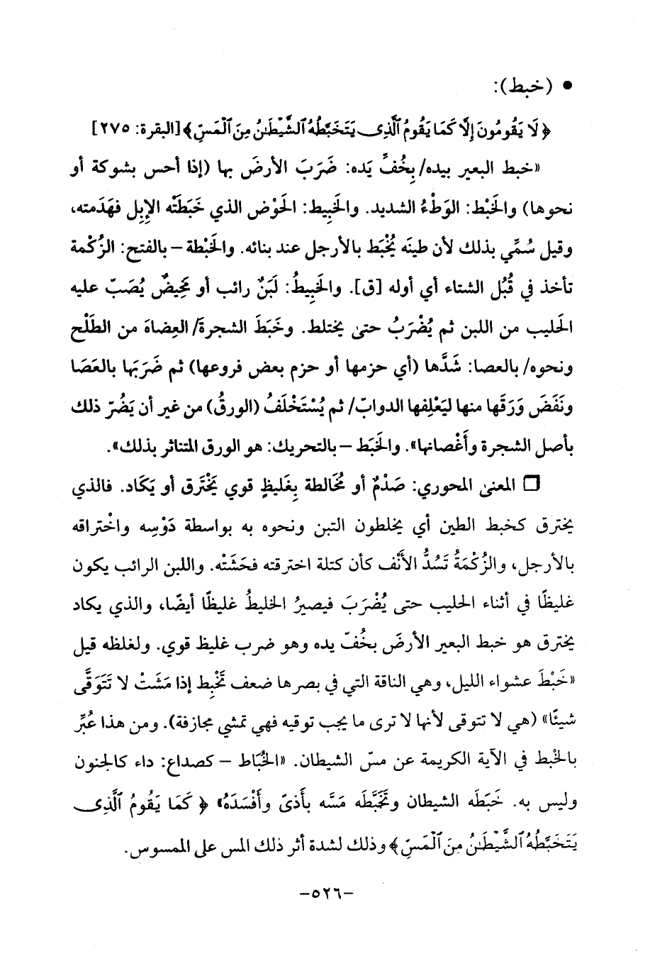 "خبط البعير بيده/ بِخُفِّ يَده: ضَرَبَ الأرضَ بها (إذا أحس بشوكة أو نحوها) والخَبْط: الوَطْءُ الشديد. والخَبِيط: الحَوْض الذي خَبَطَتْه الإِبِل فهَدَمته، وقيل سُمِّي بذلك لأن طينَه يخُبَط بالأرجل عند بنائه. والخَبْطة -بالفتح: الزّكْمة تأخذ في قُبُل الشتاء أي أوله [ق]. والخَبِيطُ: لَبَنٌ رائب أو مَحِيضٌ يُصَبّ عليه الحَليب من اللبن ثم يُضْرَبُ حتى يختلط. وخَبَطَ الشجرةَ/ العِضاهَ من الطَلْح ونحوه/ بالعصا: شَدَّها (أي حزمها أو حزم بعض فروعها) ثم ضَرَبَها بالعَصَا ونَفَضَ وَرَقَها منها ليَعْلِفها الدوابّ/ ثم يُسْتَخْلَفُ (الورقُ) من غير أن يَضُرّ ذلك بأصل الشجرة وأَغْصانها ". والخَبَط -بالتحريك: هو الورق المتناثر بذلك ".