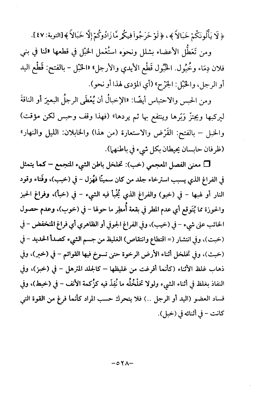 ومن تَعَطُّل الأعضاء بشلل ونحوه استُعْمل الخبْل في قطعها "لنا في بني فلان دِمَاء وخُبُول. الخُبُول قَطْع الأيدي والأرجل ""الخَبْل -بالفتح: قَطْع اليد أو الرجل، والخَبْل: الجرْح " (أي المؤدى لهذا أو نحو).