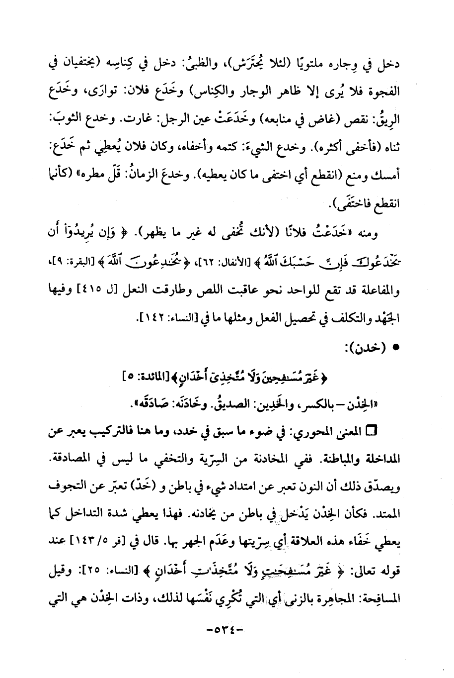 ومنه "خَدَعْتُ فلانًا (لأنك تُخفى له غير ما يظهر). {وَإِنْ يُرِيدُوا أَنْ يَخْدَعُوكَ فَإِنَّ حَسْبَكَ اللَّهُ} [الأنفال: 62]، {يُخَادِعُونَ اللَّهَ} [البقرة: 9]، والمفاعلة قد تقع للواحد نحو عاقبت اللص وطارقت النعل [ل 415] وفيها الجهْد والتكلف في تحصيل الفعل ومثلها ما في [النساء: 142] ..