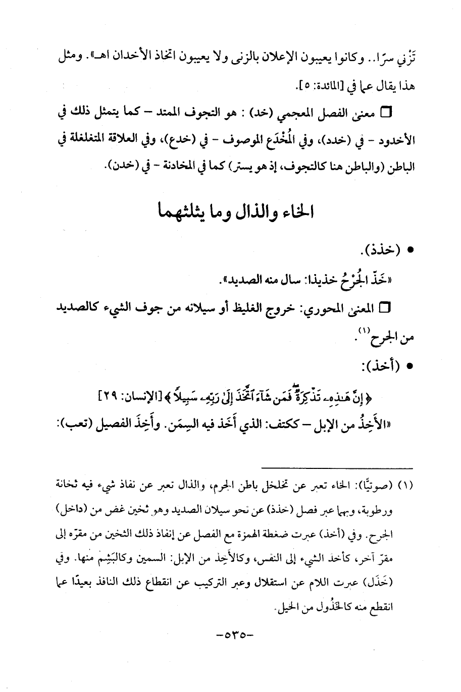 ° معنى الفصل المعجمي (خد): هو التجوف الممتد -كما يتمثل ذلك في الأخدود -في (خدد)، وفي المُخدَع الموصوف -في (خدع)، وفي العلاقة المتغلغلة في الباطن (والباطن هنا كالتجوف، إذ هو يستر) كما في المخادنة -في (خدن).