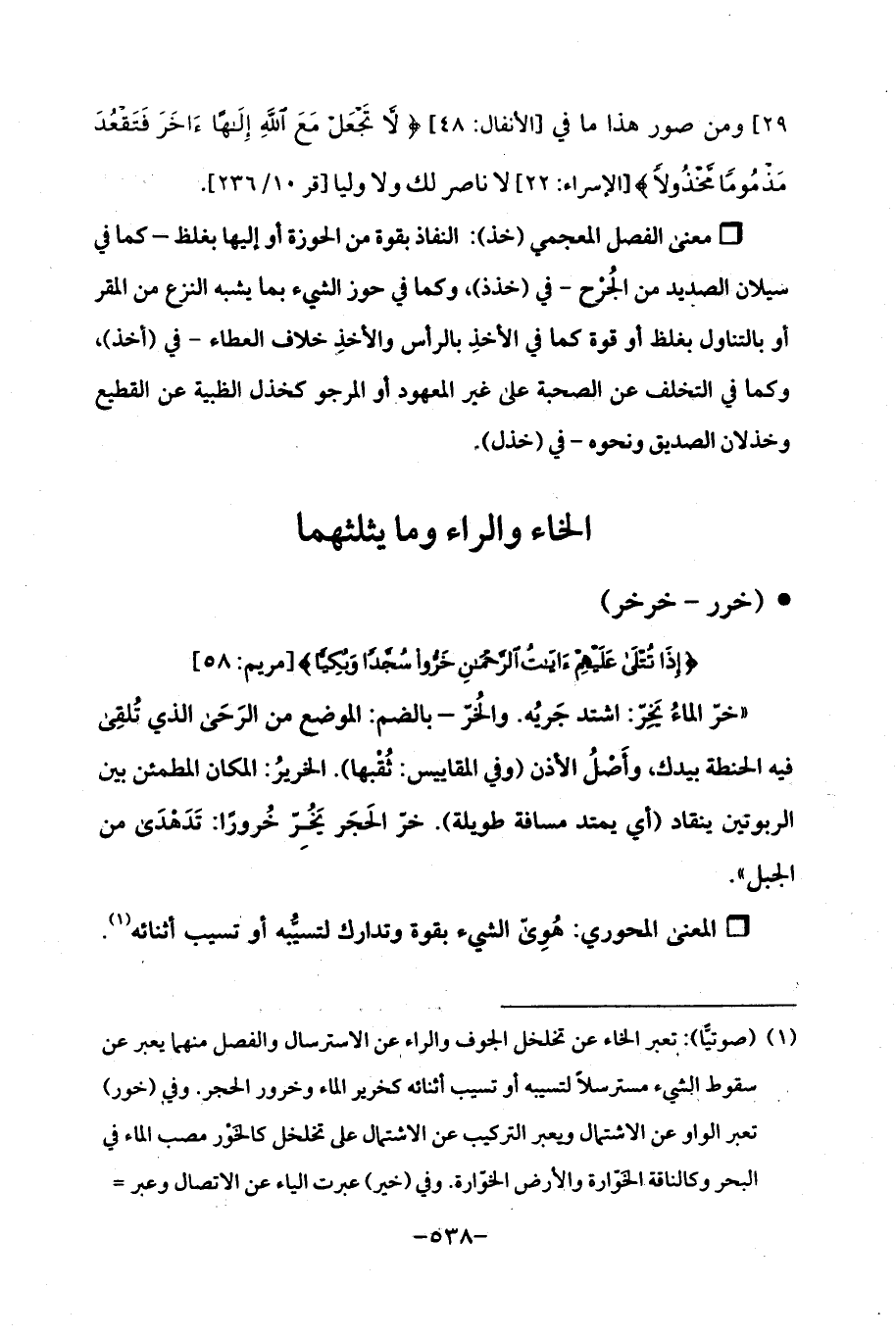 (¬1) (صوتيًّا): تعبر الخاء عن تخلخل الجوف والراء عن الاسترسال والفصل منهما يعبر عن سقوط الشئ مسترسلًا لتسيبه أو تسيب أثنائه كخرير الماء وخرور الحجر. وفي (خور) تعبر الواو عن الاشتمال ويعبر التركيب عن الاشتمال على تخلخل كالخَوْر مصب الماء في البحر وكالناقة الخَوّارة والأرض الخوّارة. وفي (خير) عبرت الياء عن الاتصال وعبر =